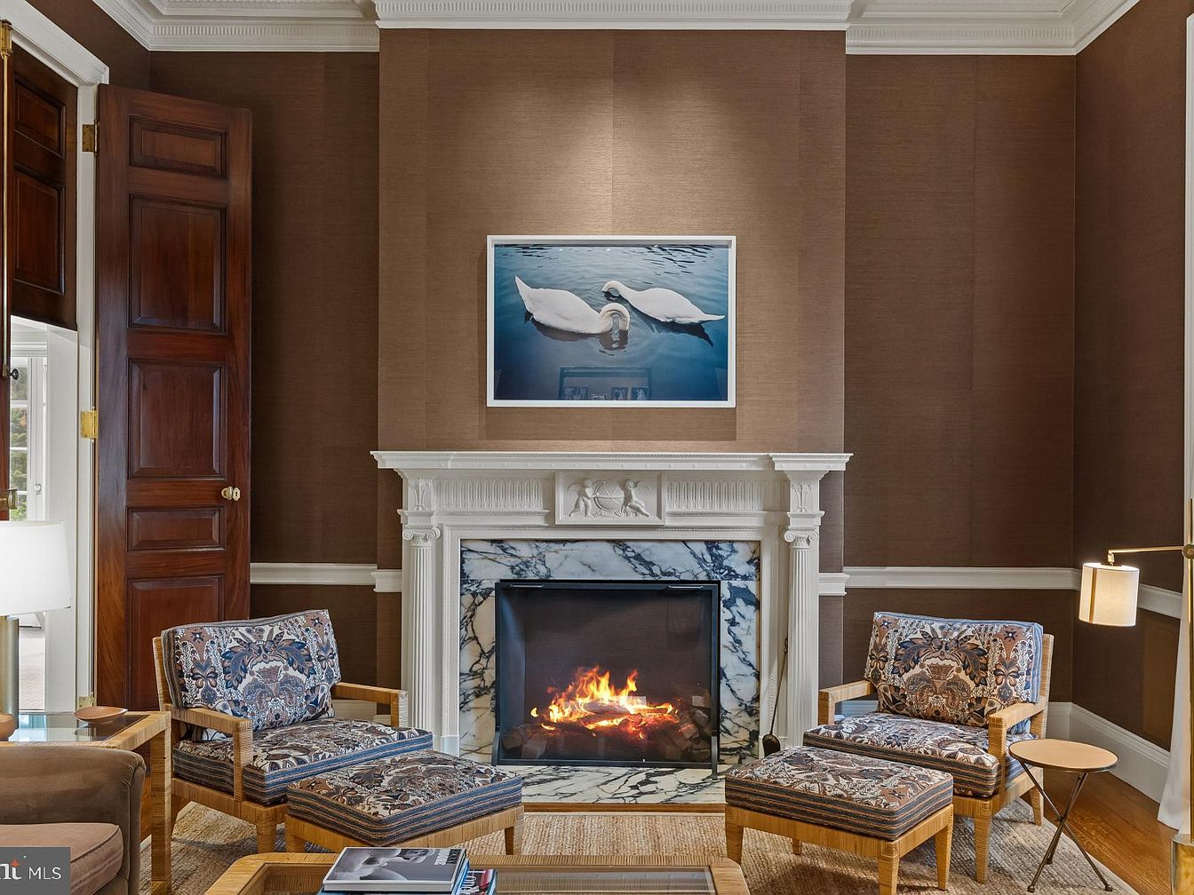 A cozy living room with an elegant design, featuring a rich brown wallpaper that adds warmth. The room centers around a stylish marble fireplace, framed by white moldings, with a crackling fire illuminating the space. Comfortable wicker armchairs with ornate upholstery invite relaxation, complemented by a small side table. A soft area rug warms the wooden floor, contributing to the inviting atmosphere. A large photograph of a serene white swan hangs above the mantle, providing a focal point that contrasts beautifully with the darker hues. Architectural details like crown molding enhance the historic charm of this inviting space.