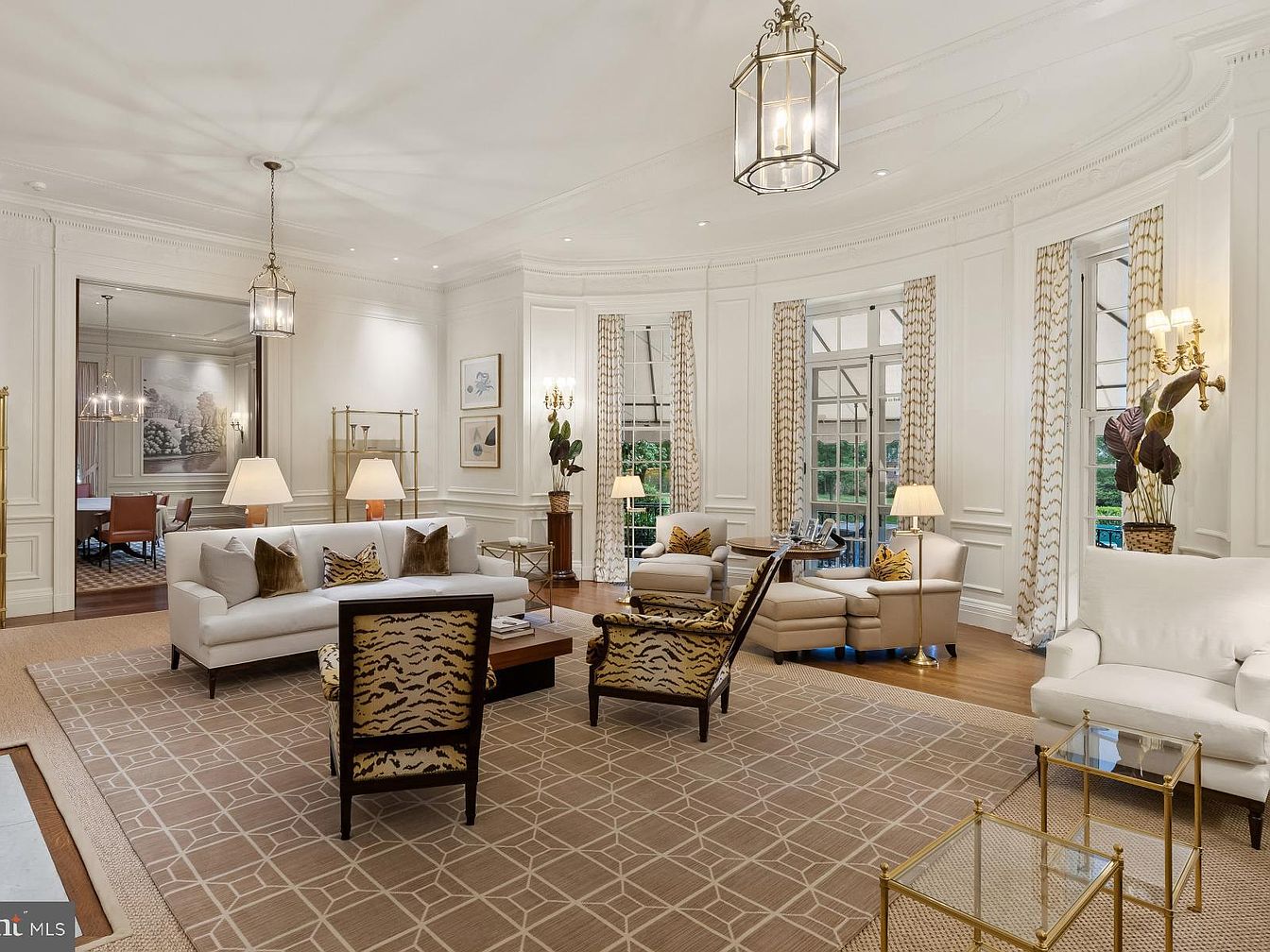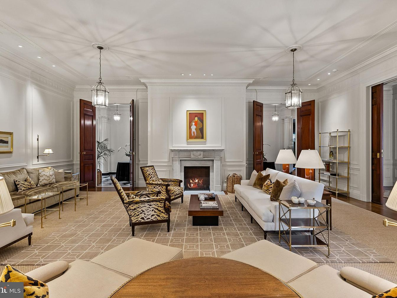 The living room features a refined design with a blend of classic and modern elements. A white color scheme dominates the walls, complemented by intricate moldings and polished wood accents. The seating includes a light-toned sofa adorned with plush cushions, paired with two stylish armchairs showcasing a bold animal print. A central coffee table adds warmth with its dark wood finish, surrounded by a geometric patterned area rug. Elegant lighting from a pendant fixture and lamps casts soft shadows, enhancing the cozy atmosphere. A marble fireplace serves as a focal point, framed by tasteful artwork and decorative accessories.