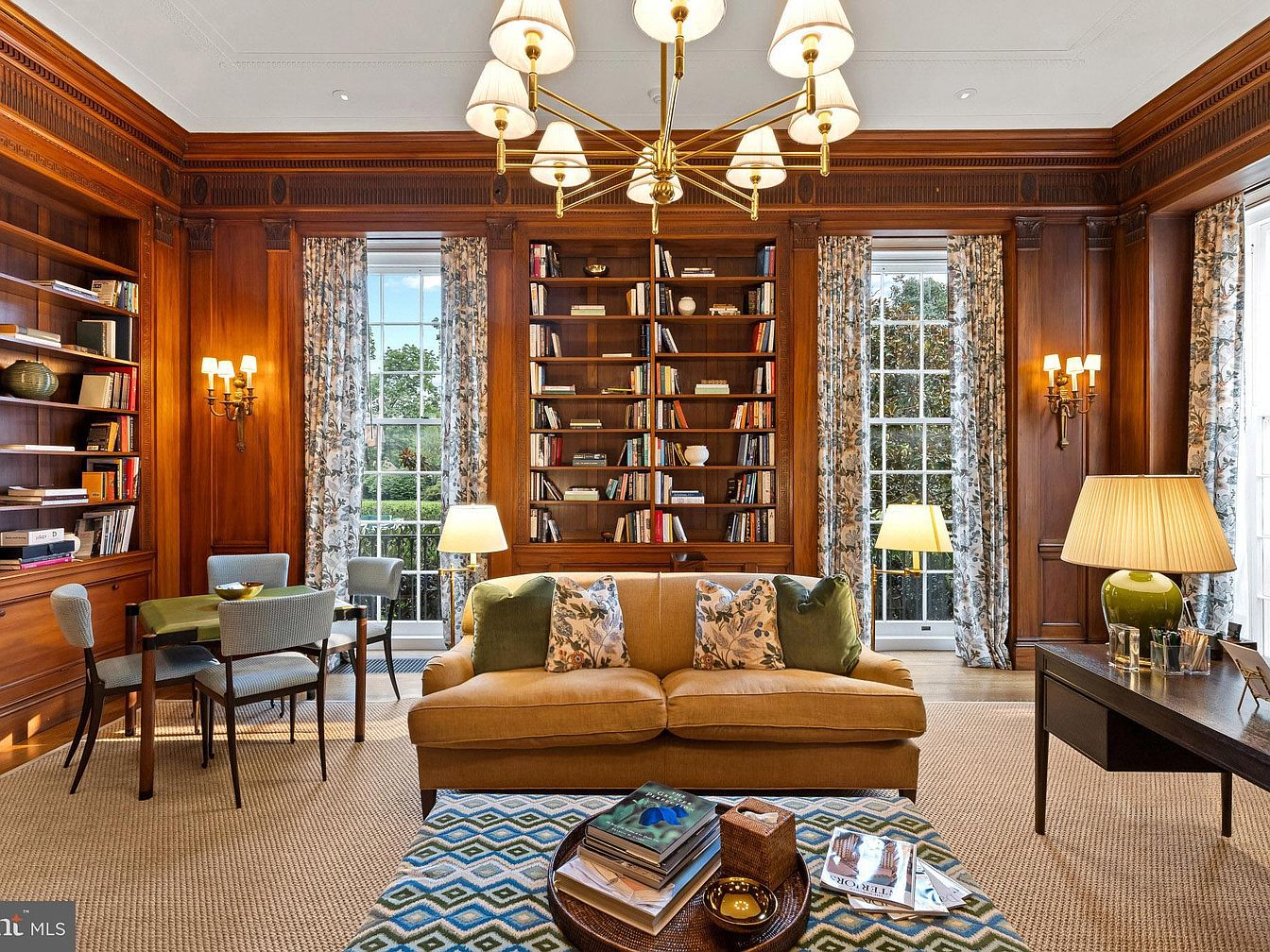 This elegant living room features rich wooden paneling that creates a warm and inviting atmosphere. A plush, tan sofa is accented by decorative pillows in green and floral patterns, adding comfort and style. The geometric area rug offers a pop of color with its blue and beige hues. To one side, a wooden bookshelf displays an array of books, while nearby, a small dining table with modern chairs invites cozy conversations. Large windows dressed in floral curtains allow natural light to illuminate the space, complemented by stylish sconces and a contemporary chandelier, enhancing the room’s sophisticated charm.