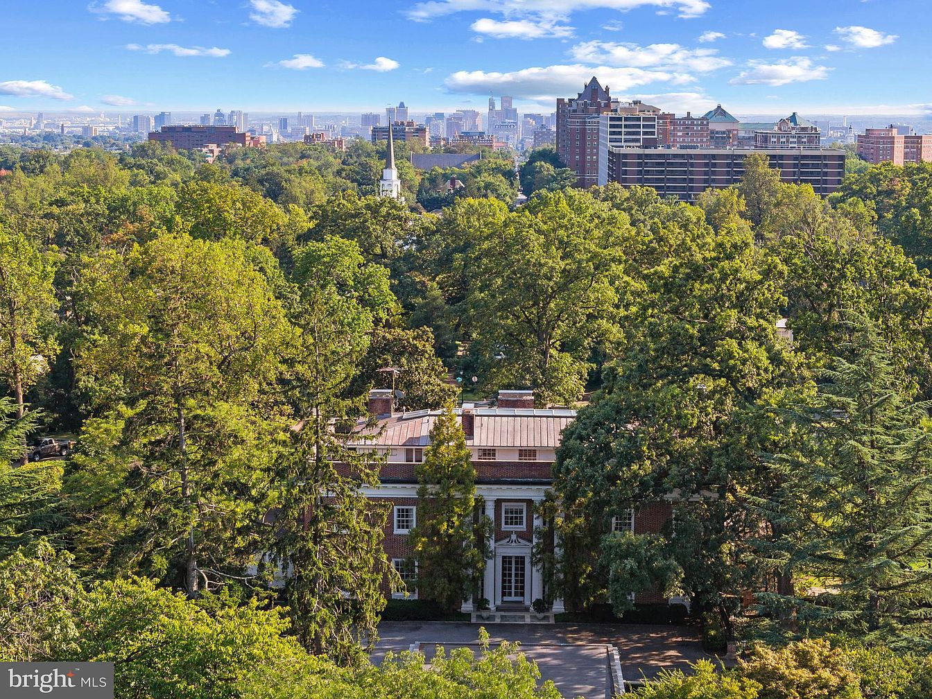 The image showcases a historic American home, enveloped by lush greenery and mature trees. The architectural style features classic elements, with a facade of warm brick and white trim that highlights the grandeur of the structure. The front entrance is flanked by elegant columns, adding an air of sophistication. Beyond the property, a skyline emerges, juxtaposing the tranquility of the house against the modern city backdrop. Rich shades of green dominate the scenery, creating a serene atmosphere. The presence of the church spire in the distance adds a hint of historical context to the vibrant setting.