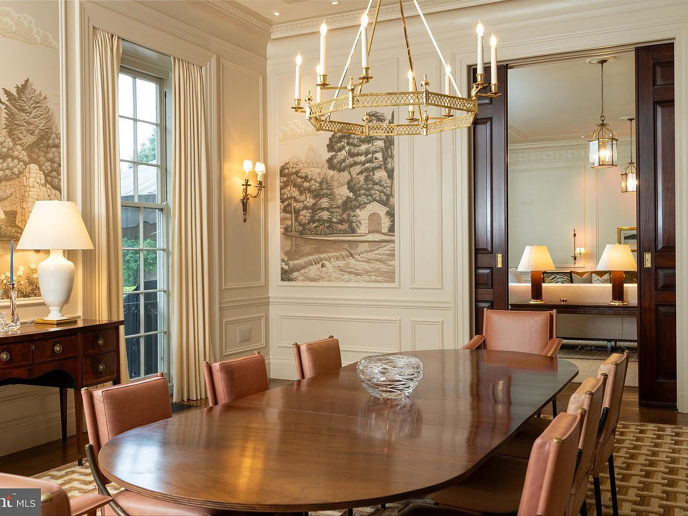 A spacious dining room features an elegant wooden table surrounded by upholstered chairs with leather details. The walls are adorned with intricate mural artwork, depicting serene landscapes. Large windows draped with soft, light-colored curtains allow natural light to flow in, enhancing the warm atmosphere. A decorative chandelier hangs above the table, casting a soft glow complemented by wall sconces. The polished wooden sideboard displays a chic vase, while the geometric patterned rug adds texture to the hardwood floor. Architectural moldings and high ceilings contribute to the room’s refined elegance, making it an inviting space for gatherings.