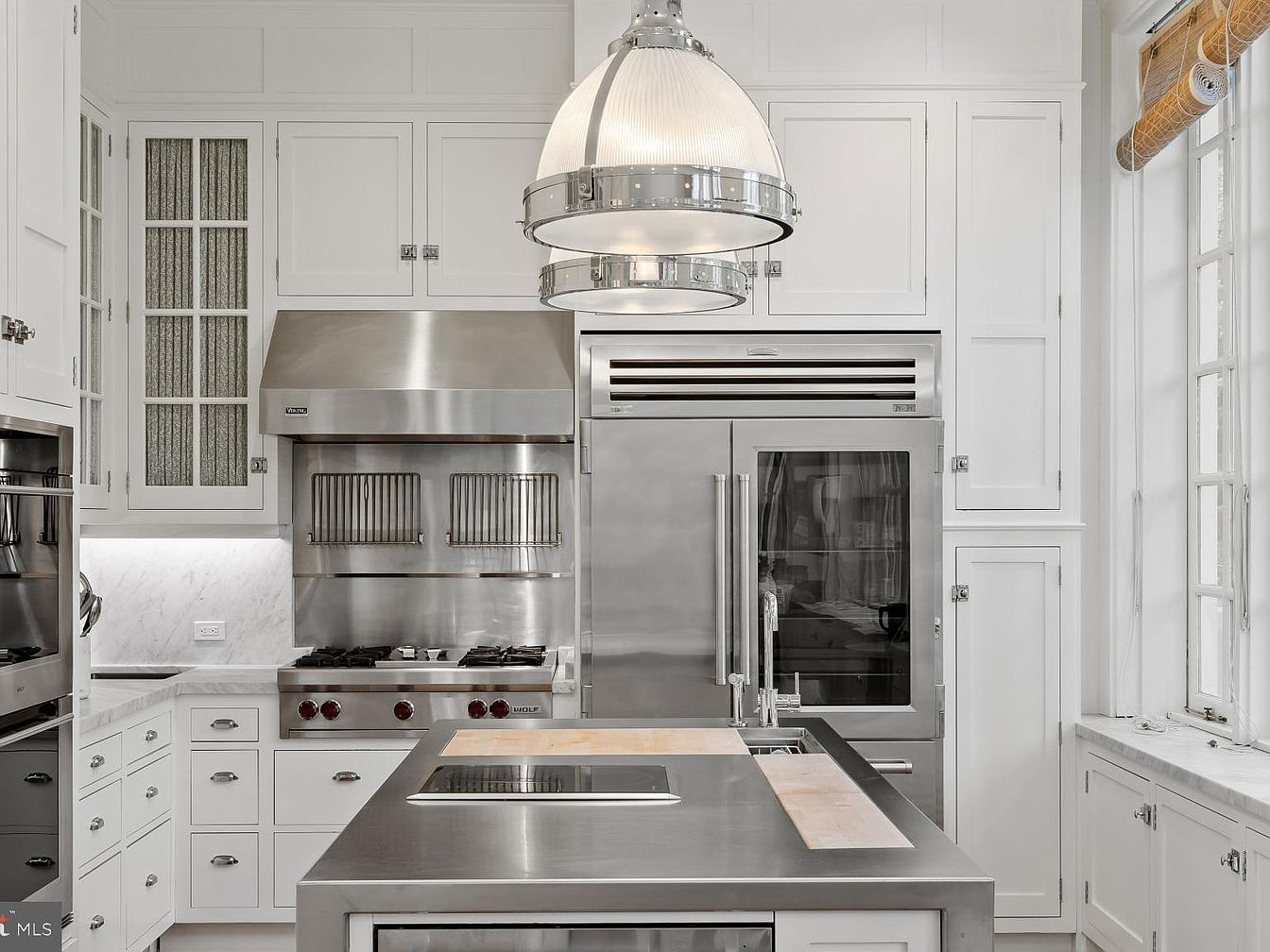 This kitchen showcases a sleek, modern aesthetic with a predominately white color scheme, complemented by stainless steel appliances. The cabinetry features clean lines and minimalistic design, providing a seamless look. A prominent island sits at the center, incorporating a wooden countertop that adds warmth to the space. Above, a stylish pendant light illuminates the area, enhancing its contemporary feel. High-end appliances, including a gas range and built-in refrigerator, emphasize a professional quality. Marble countertops and a backsplash offer a luxurious touch, while large windows allow natural light to flood in, creating an inviting atmosphere.
