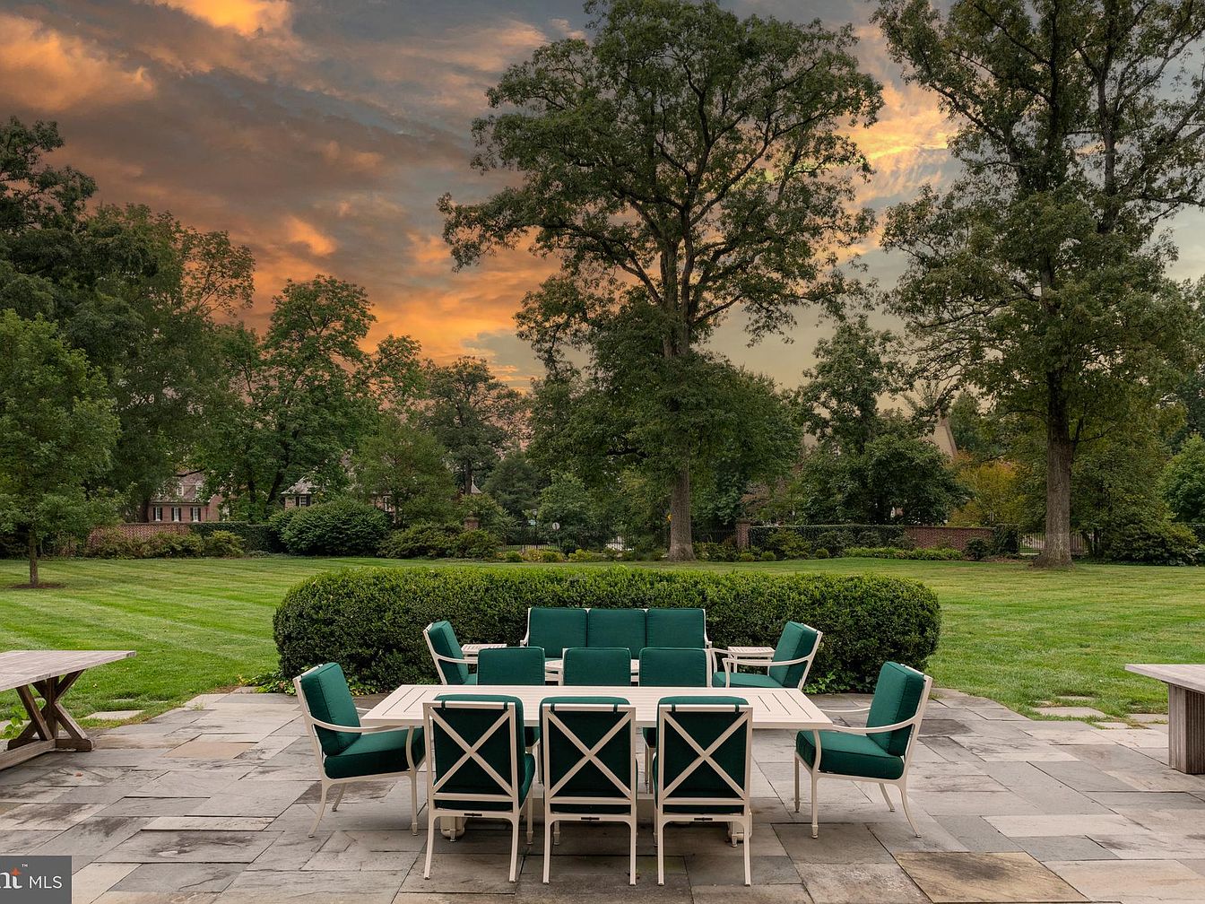 A spacious outdoor patio offers a serene retreat, surrounded by well-manicured greenery and a lush lawn. The patio features a stone surface, with a large table set for outdoor dining, complemented by cushioned chairs. Architectural elements include a prominent overhanging awning that provides shade, while the classic brick facade of the home adds to the historic aesthetic. Flanking the space are neatly trimmed hedges and ornamental shrubs, enhancing the outdoor atmosphere. The warm glow of evening light creates an inviting ambiance, making this area perfect for gatherings or quiet enjoyment of nature.