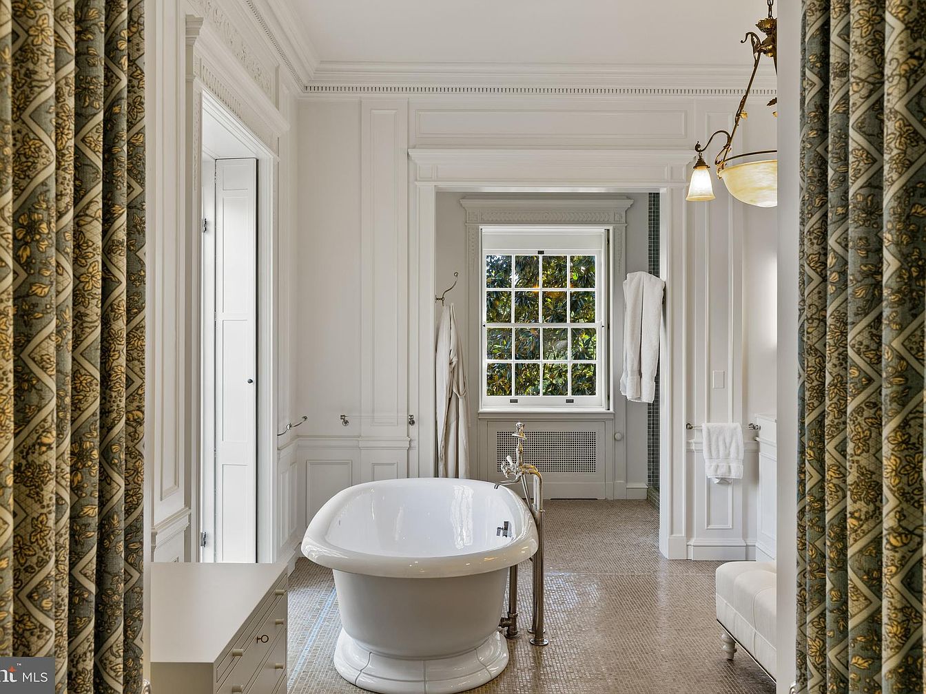 This luxurious bathroom showcases a vintage freestanding tub as the focal point, set against a backdrop of pristine white walls adorned with intricate paneling. Natural light floods the space through a large window with elegant muntins, complementing the white and cream color scheme. Fabrics with ornate patterns drape beside the window, introducing a touch of rich color. A plush white chaise lounges in one corner, enhancing comfort, while the polished tile flooring adds sophistication. Decorative elements like a vintage-style light fixture hang above, contributing charm and warmth to this serene retreat.