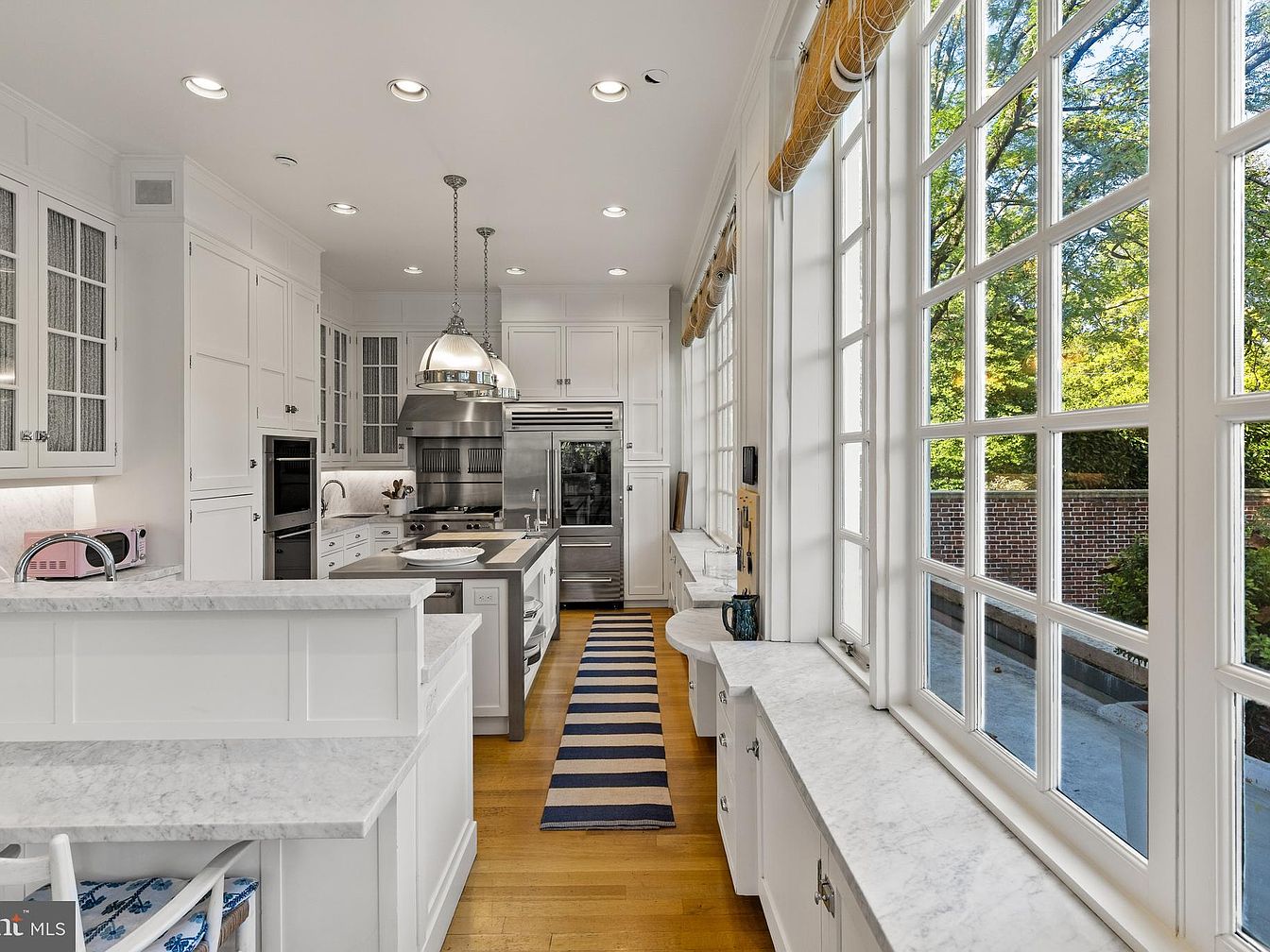 This kitchen features a spacious layout with white cabinetry and marble countertops, creating a clean and modern aesthetic. Large windows fill the room with natural light, highlighting the polished wooden floors and elegant hardware. The open design includes a white bar area with four matching chairs, each adorned with blue floral cushions, adding a touch of color. A polished metallic pendant light hangs above the bar, complementing the stainless steel appliances positioned along the back wall. Beneath the windows, built-in cabinetry offers functional storage, while bamboo shades provide a warm contrast to the bright, airy atmosphere.