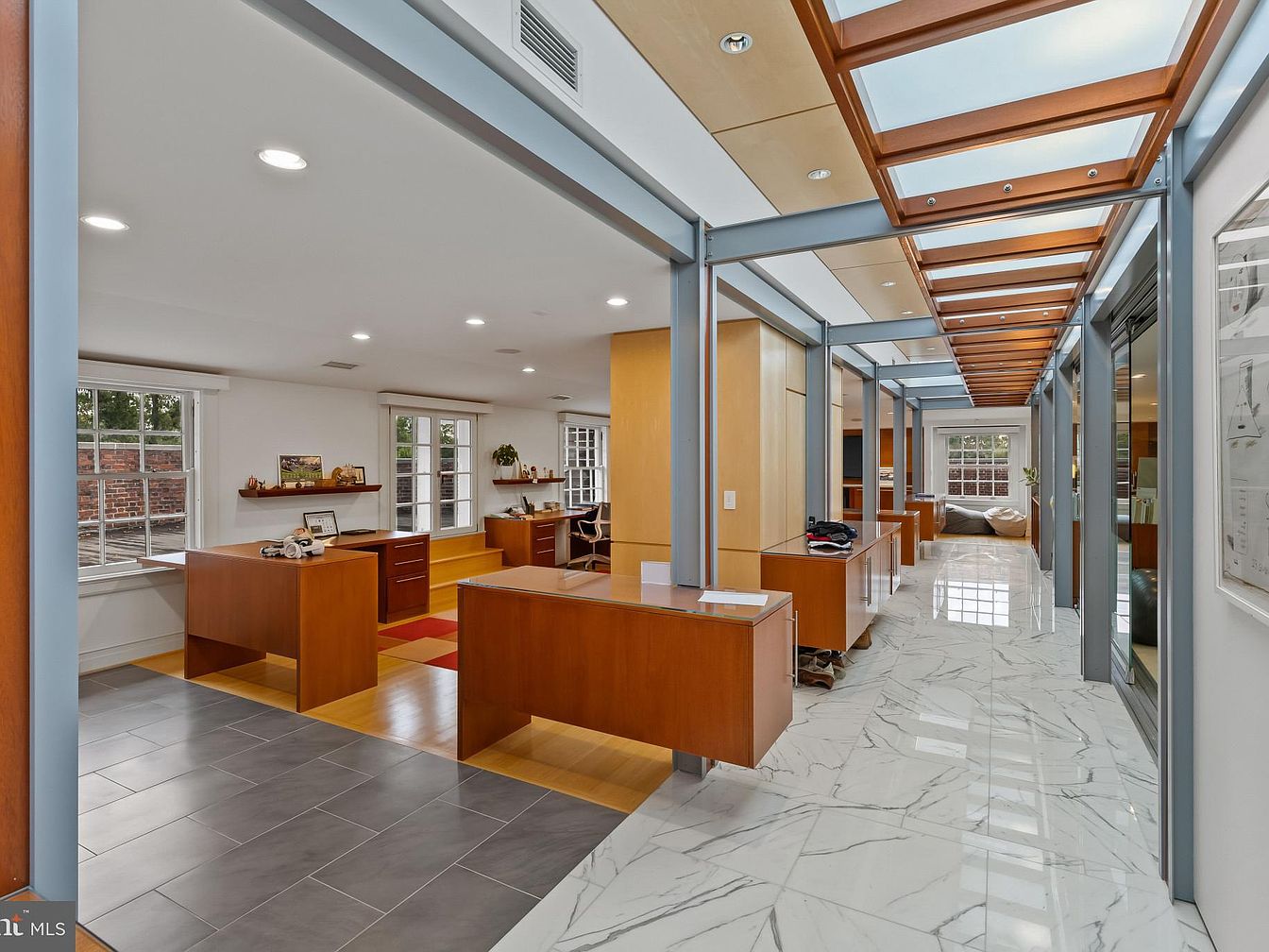 This modern home office showcases an open layout with clean lines and a blend of materials. The space features sleek wooden cabinetry, offering both function and warmth. A combination of light and dark flooring enhances the area, with gray tiles transitioning to light bamboo. Large windows fill the room with natural light, reflecting off the polished marble-like floor. A series of glass panels above provide additional illumination, creating an airy atmosphere. Minimalist furniture, including stylish office chairs and desktop displays, emphasizes a contemporary aesthetic, while various decorative items on shelves add character.