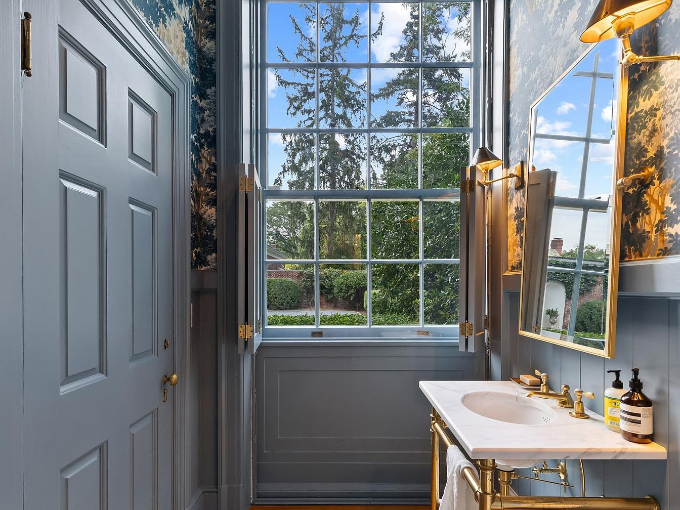 This elegant bathroom features a spacious design with high ceilings and large windows that invite natural light. The walls are adorned with a floral wallpaper, harmonizing with soft blue paneling that enhances the serene atmosphere. A stylish vanity showcases a white marble countertop paired with polished brass fixtures. The sink is integrated seamlessly with the brass plumbing, while two mirrors reflect light and space. A large window offers a picturesque view of lush greenery outside, blending indoor and outdoor elements. The intricate door adds a classic touch, contributing to the room’s historic charm.