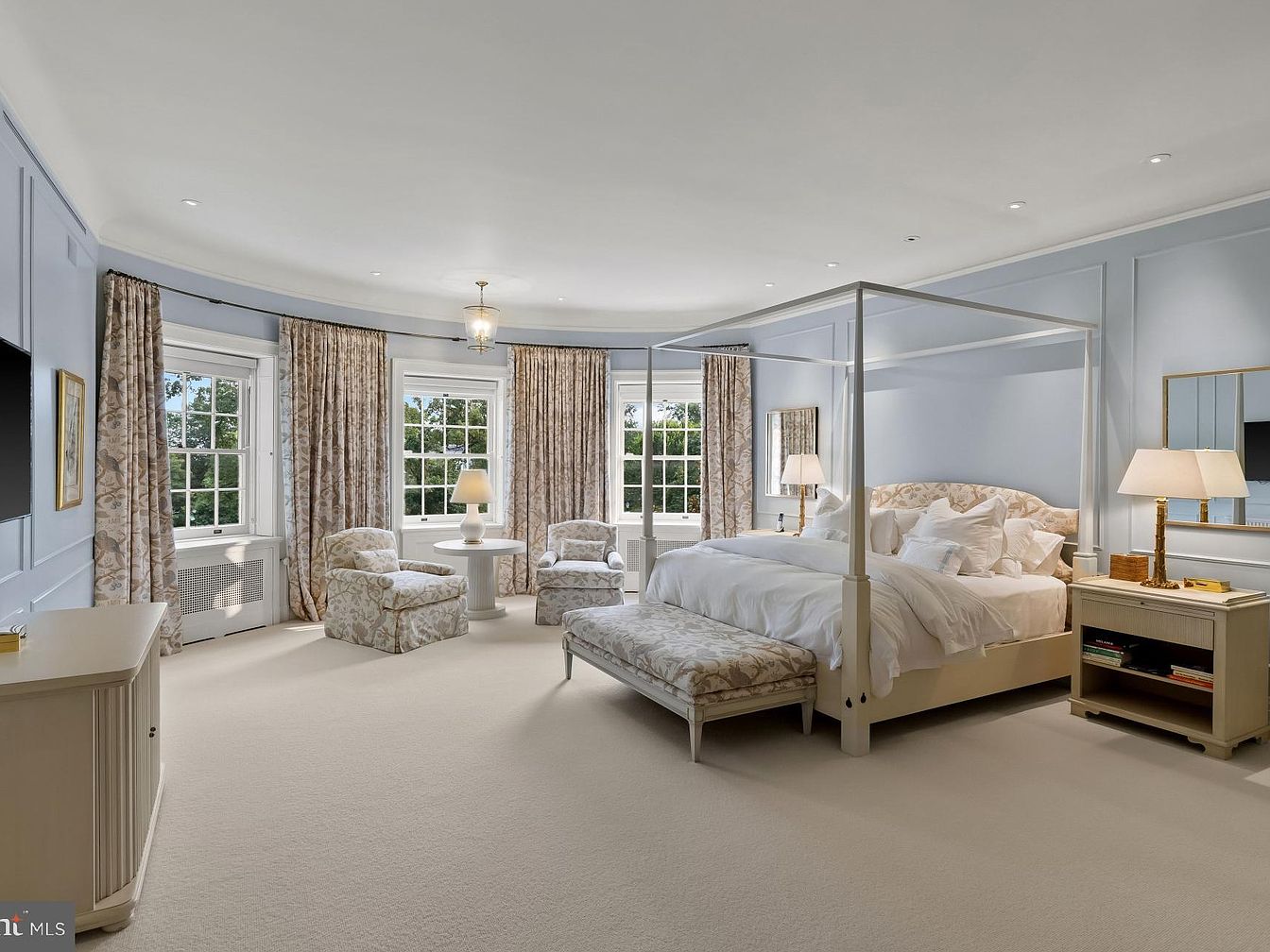 This bright, airy bedroom features a soft blue color scheme complemented by floral-patterned drapes and seating. The large windows allow for ample natural light, showcasing the lush greenery outside. A round table sits between two elegant armchairs, enhancing the inviting atmosphere. The king-sized bed, adorned with a crisp white duvet, is paired with a charming, floral patterned daybed at the foot. Architectural details include wide moldings and baseboards, along with a subtle chandelier that adds sophistication. The plush, pale carpet enhances the comfort of the space, creating a serene retreat that feels both timeless and welcoming.