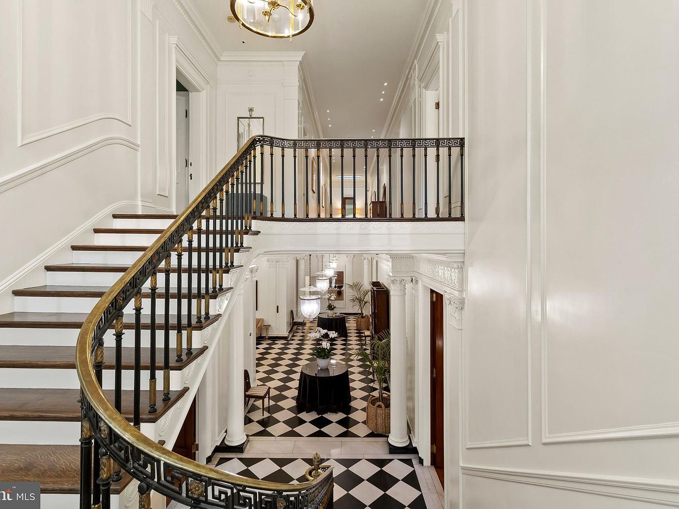 A grand entryway featuring a sweeping staircase with a polished wooden railing, elegantly curving to the upper level. The expansive walls are coated in a bright white, accentuating the intricate moldings and architectural details. The floor showcases a striking black and white checkered pattern, leading to a sophisticated seating area furnished with a round table adorned by fresh flower arrangements. Ambient lighting is provided by decorative pendant fixtures hanging from the high ceiling. The overall atmosphere embodies classic elegance, seamlessly blending historical charm with refined elegance in every design detail.
