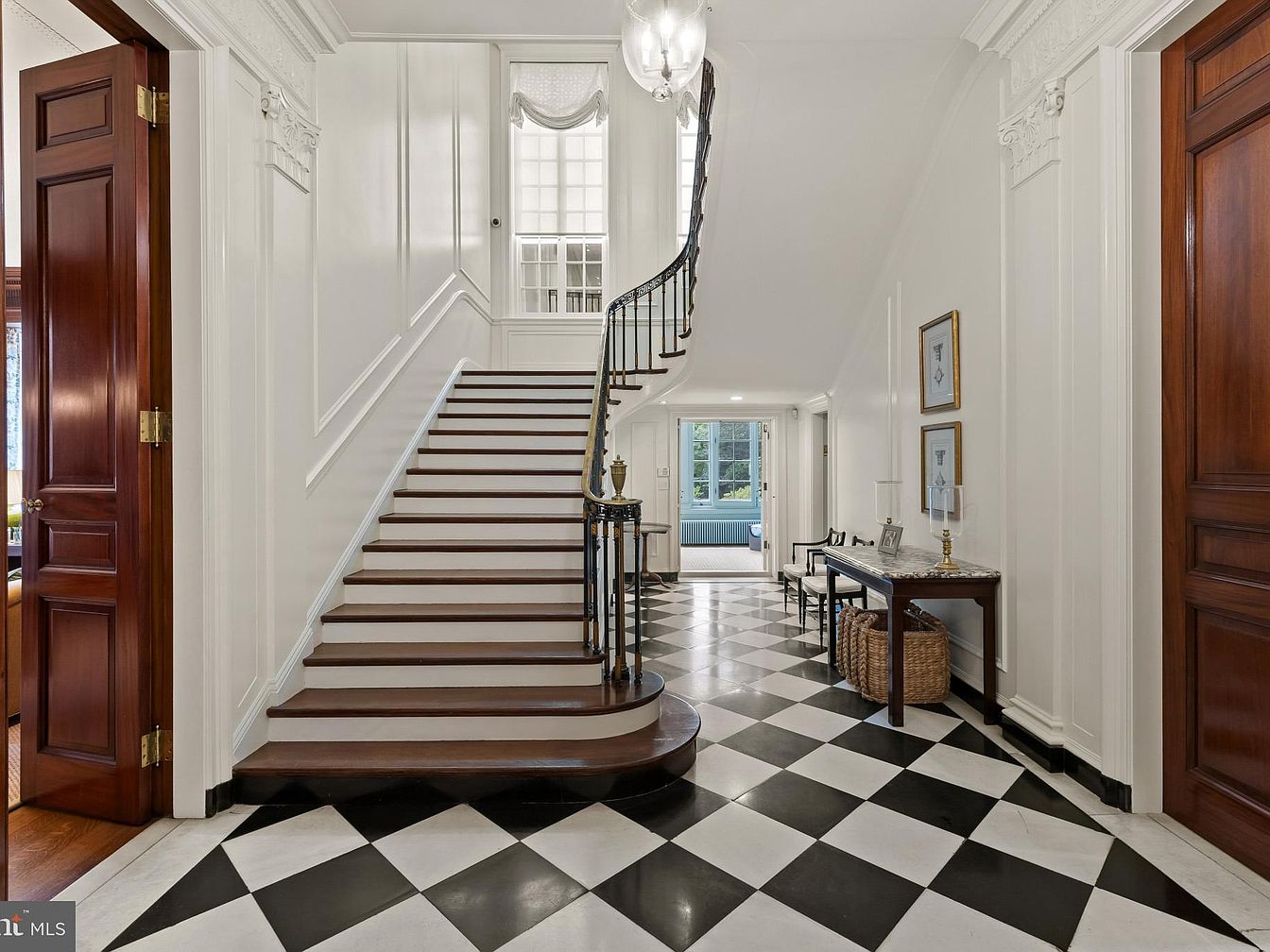 The entry hall showcases a grand staircase with a polished wooden handrail, ascending to the upper level. The floor features an elegant black and white checkered pattern, creating a striking contrast against the crisp white walls adorned with intricate moldings. A pair of richly stained wooden doors flank the space, adding warmth and a sense of history. Natural light floods in through tall windows, highlighting a stylish console table with a marble top. Flanking the table are decorative elements, including a candle holder and a woven basket, enhancing the inviting and sophisticated ambiance of this historic entryway.