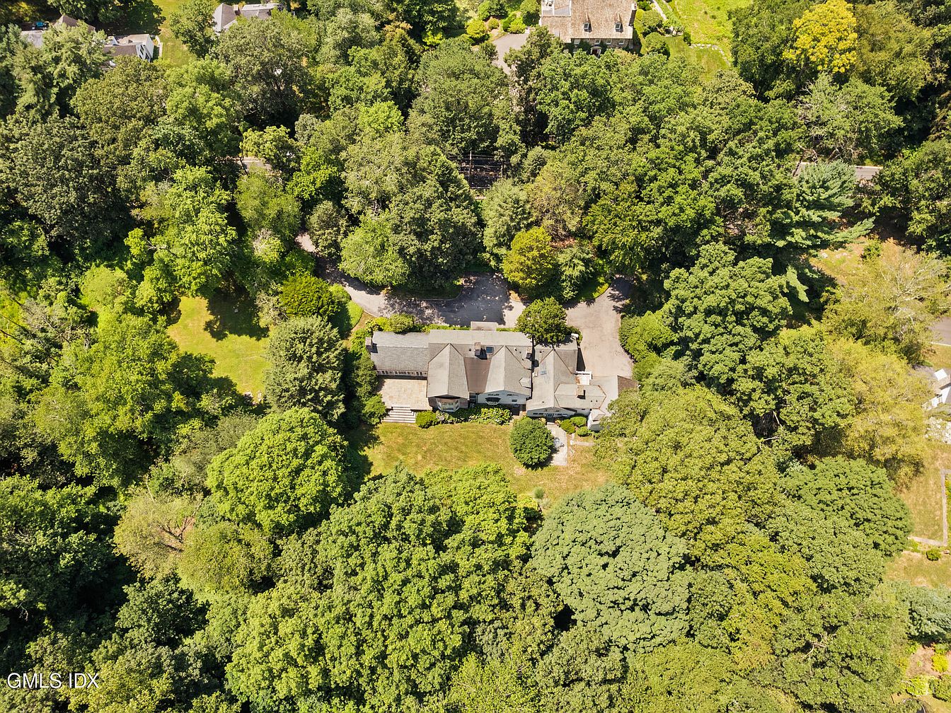 An aerial view of a sprawling historic American home nestled within lush greenery. The property features a well-maintained lawn surrounded by mature trees that provide a vibrant, natural backdrop. The house showcases a classic architectural style with a mix of gable roofs and various extensions. A paved driveway gracefully curves around the house, facilitating easy access. The exterior is adorned in a muted shade, harmonizing with the surrounding nature. Patios and walkways lead to different sections, enhancing the inviting layout. The overall aesthetic combines tranquility with elegance, offering a picturesque retreat in a wooded setting.