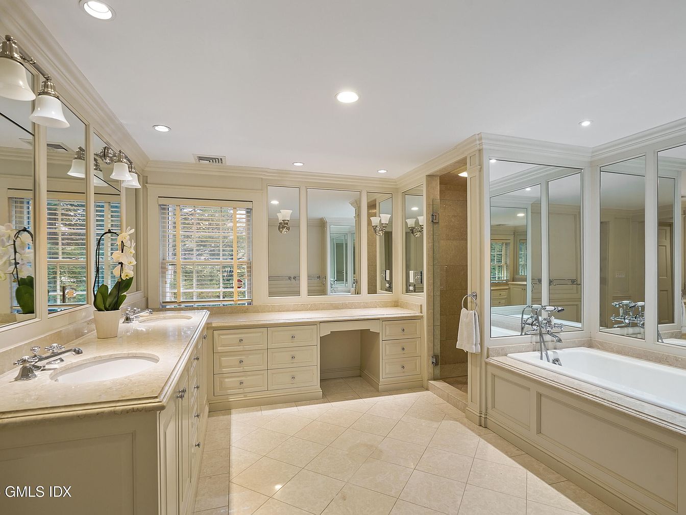 This spacious bathroom features elegant cream-colored cabinetry and dual sinks, enhancing its luxurious feel. A long vanity with polished countertops and ample storage complements the overall design. Natural light floods the room through large windows adorned with wooden blinds, accentuating the soft hues of the decor. Mirrored panels line the walls, creating a sense of openness and reflecting the tasteful lighting fixtures. The shower area, with its subtle tile work, blends seamlessly with the refined aesthetics. A relaxation zone includes a freestanding tub, positioned for comfort and tranquility amidst the sophisticated surroundings.
