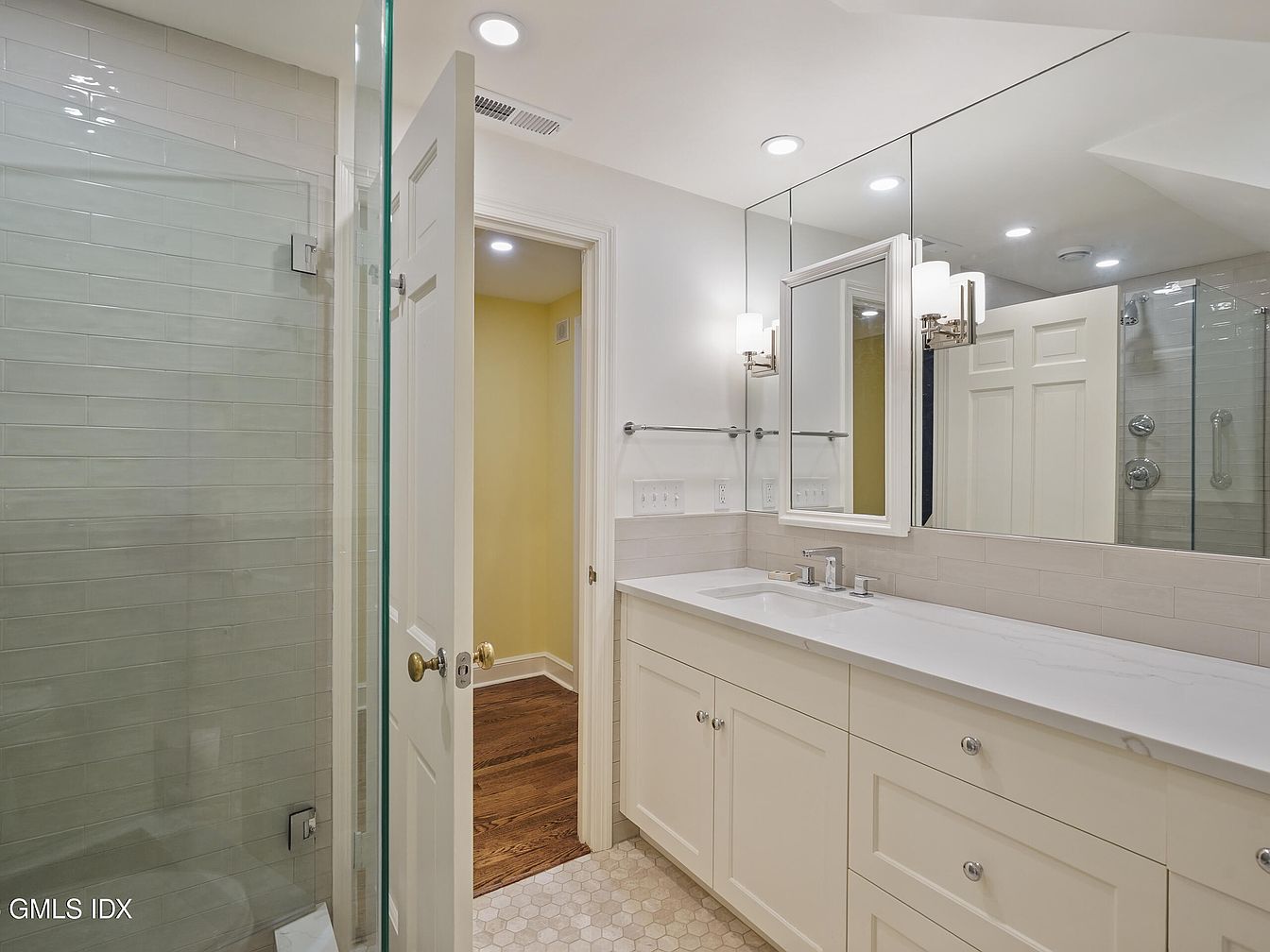 This modern bathroom features a sophisticated layout with a dual vanity and an elegant walk-in shower. The color scheme leans towards soft neutrals, highlighted by cream cabinetry and a striking black granite countertop. Above the sink, a large mirror reflects ample light from stylish, wall-mounted sconces. The shower area is enclosed with glass, showcasing sleek tile work adorned with subtle green diamond accents. Architectural details include crown molding along the ceiling, contributing to an upscale ambiance. The blend of modern fixtures and classic elements creates a harmonious and inviting space for relaxation.