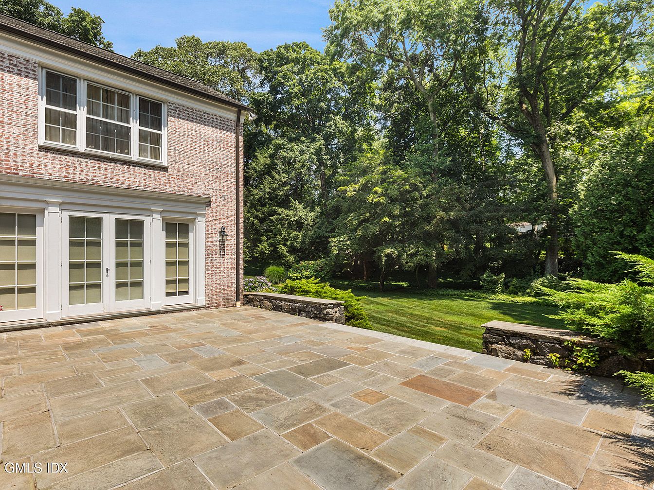 A spacious patio area extends from the house, embellished with large, natural stone tiles that showcase a blend of earthy tones, enhancing the rustic charm. The exterior wall features classic red brick, harmonizing beautifully with the surrounding greenery. French doors framed in white provide an inviting entrance to the interior, complemented by elegant outdoor lighting fixtures. Beyond, a lush lawn stretches out, bordered by mature trees that create a serene and private backdrop. The combination of the stone patio and vibrant landscape evokes a tranquil atmosphere, perfect for outdoor gatherings or quiet reflection.