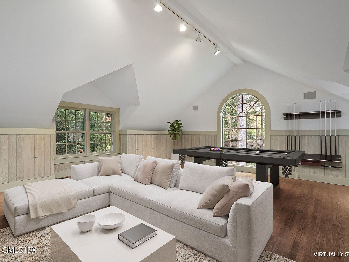 This spacious game room features a vaulted ceiling, accentuating the airy feel. Light walls complement the rich wooden flooring, creating a warm ambiance. A contemporary sectional sofa adorned with plush pillows invites relaxation, facing a sleek coffee table. Opposite the seating area, a stylish billiard table is showcased, well-positioned under multi-directional lighting. Natural light floods in through an elegant arched window, surrounded by greenery, enhancing the room’s tranquil atmosphere. Tastefully-designed cabinetry along the walls offers storage, while subtle decorative elements contribute to the room’s sophisticated yet cozy aesthetic, perfect for both entertaining and leisure activities.