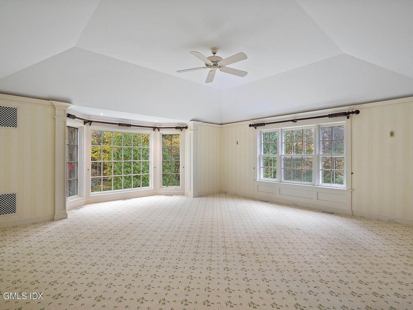 The sunroom features a beautifully finished, high-pitched ceiling that enhances the brightness of the space. Large bay windows surround the room, offering expansive views of the garden outside while flooding the interior with natural light. The walls are painted a soft cream color, adorned with subtle vertical stripes that add texture. A delicate floral patterned carpet extends across the floor, providing a warm and inviting ambiance. Simple but elegant window treatments frame the windows, contributing to the serene aesthetic. The room’s overall layout encourages relaxation, ideal for enjoying a book or simply soaking in the sun.