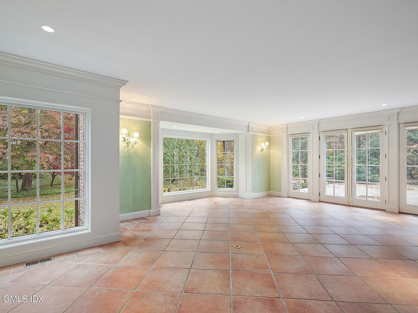 This sunroom features expansive, multi-paneled windows that invite abundant natural light and showcase views of the landscaped garden. The color palette includes soft greens on the walls, which enhance a fresh, tranquil atmosphere. Light fixtures on the walls provide a delicate glow, complementing the bright environment. The flooring consists of terracotta tiles, adding a warm, earthy texture to the space. Architectural details include crown molding along the ceiling and stylish French doors leading outside. The overall design emphasizes openness, making it an ideal space for relaxation or social gatherings, seamlessly connecting indoor comfort with outdoor beauty.