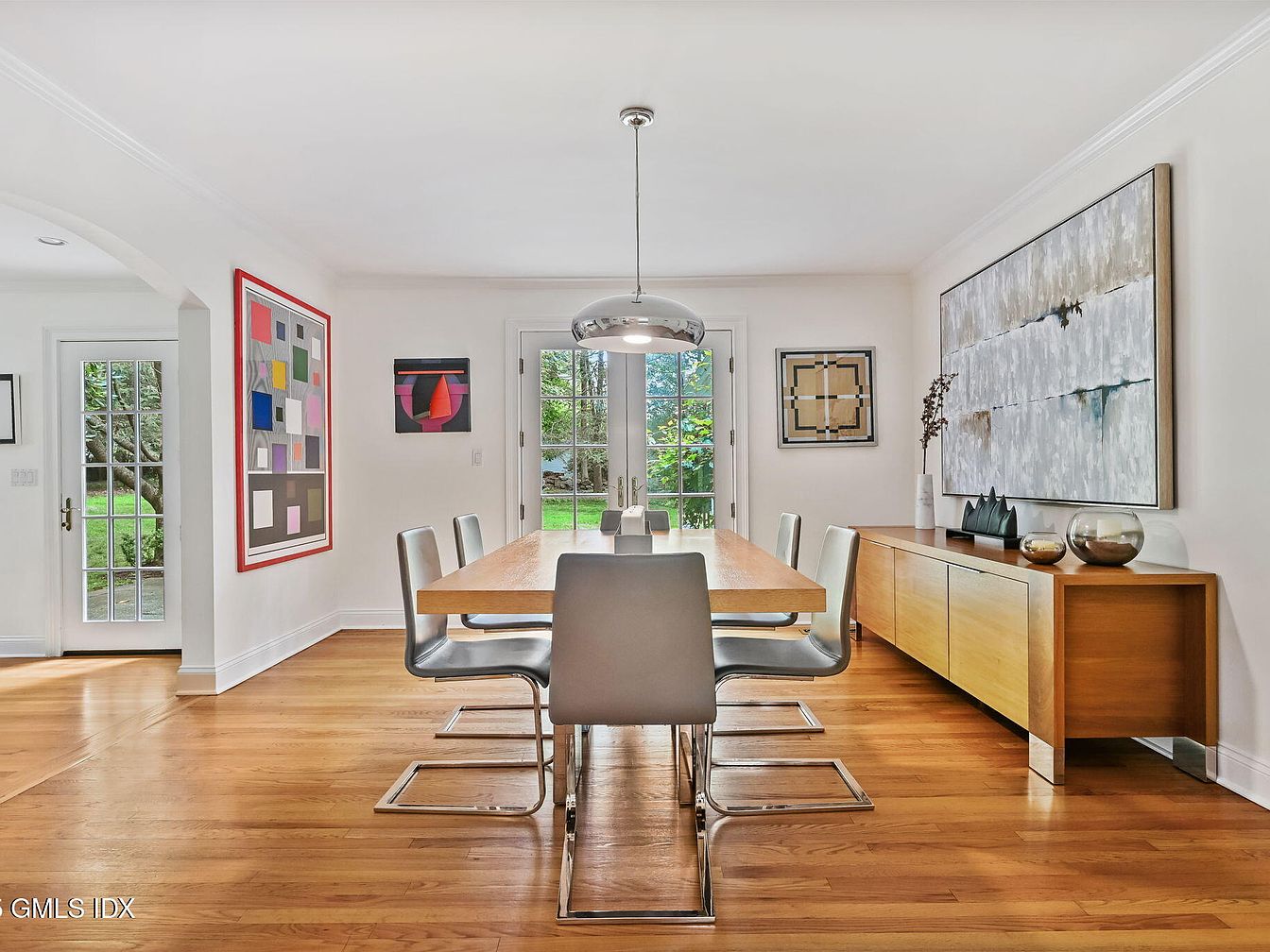 This dining room exudes a modern aesthetic with an elongated wooden table at its center, surrounded by sleek, white chairs on chrome legs. A soft, neutral color palette of whites and light wood complements the room, enhanced by a radiant pendant light overhead. The walls feature bold contemporary art, including a large colorful piece and a textured abstract painting, adding visual interest. Light floods in through the French doors, opening to a lush outdoor view, while a sideboard in warm wood tones completes the layout, showcasing decorative vases that harmonize with the overall design.
