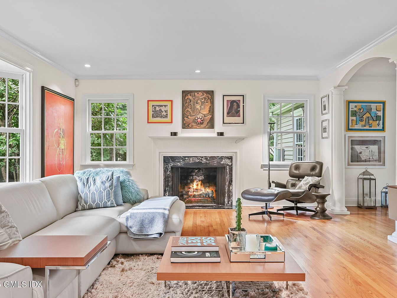 This living room features a bright, inviting atmosphere with ample natural light streaming through large windows. A sleek white leather sectional sofa is adorned with textured pillows, providing comfort. An elegant coffee table, made of mixed materials, showcases art books and decorative items. The space is anchored by a traditional fireplace with a decorative mantle, flanked by framed artwork that introduces vibrant colors. Dark wooden floors contrast against the light-colored walls, enhancing the cozy feel. A stylish lounge chair complements the decor, while the overall layout promotes a harmonious blend of modern and classic aesthetics.
