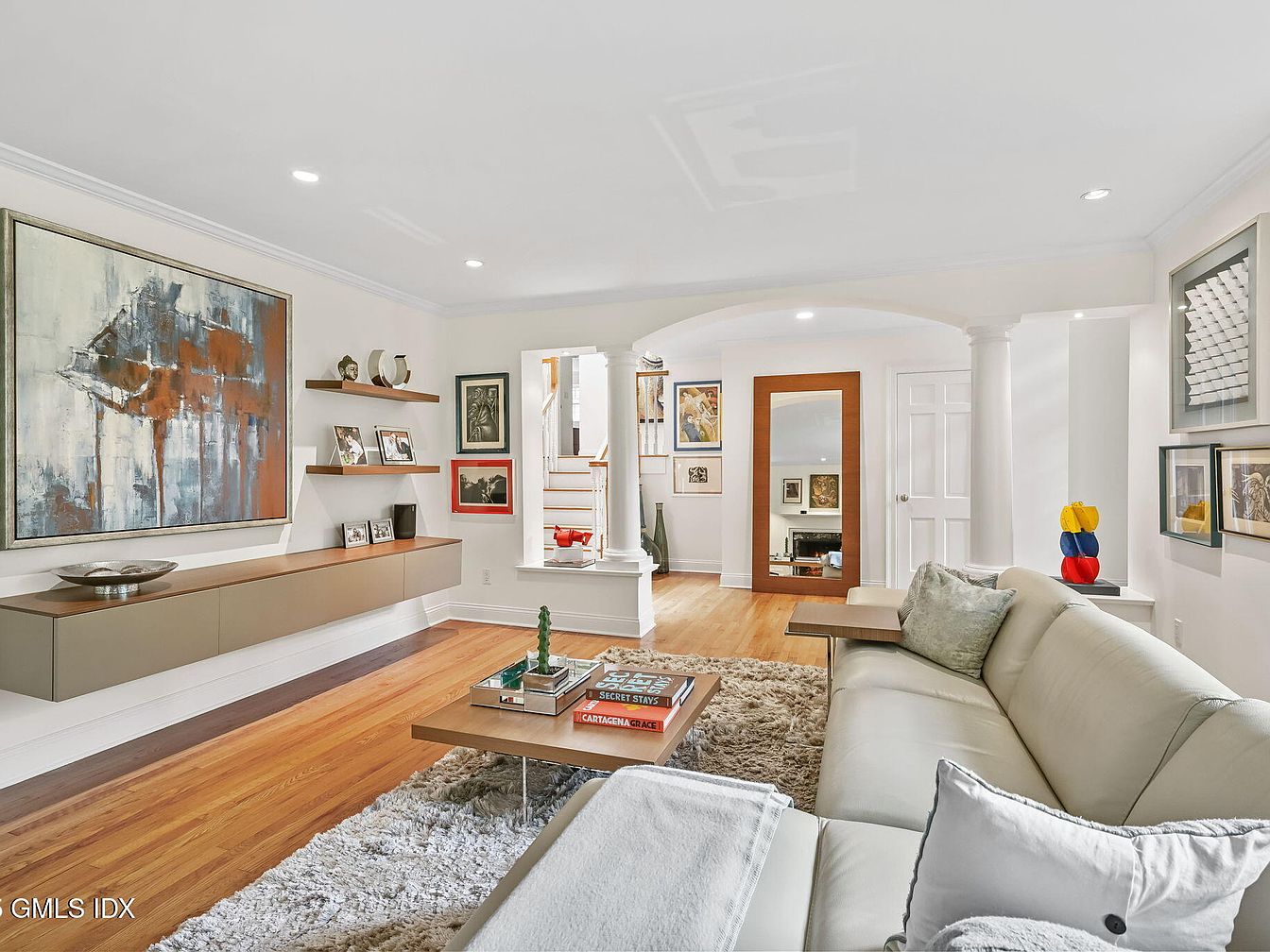 This spacious living room features a contemporary design with a neutral color palette. A large abstract painting, rich in earthy tones, anchors the main wall. Below, a modern floating shelf displays framed photographs and decorative items, blending functionality with style. The sleek sectional sofa, upholstered in light leather, offers comfort, complemented by plush throw pillows. A shaggy area rug adds warmth to the hardwood floor, enhancing the cozy atmosphere. Architectural details include rounded columns and recessed lighting, creating an inviting ambiance. The room flows seamlessly into an adjoining hallway, showcasing additional artwork and a stylish mirror.