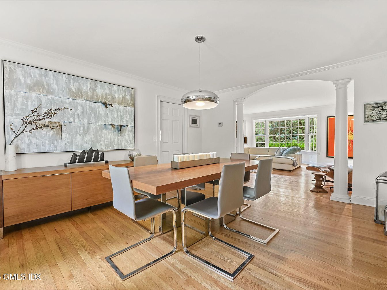 A modern dining area showcases a sleek wood table complemented by stylish, light gray chairs with chrome legs. A striking large artwork hangs on the wall, featuring abstract textures in soft blues and whites. A low, wooden sideboard adds warmth while providing practical storage beneath the wall art. The room is well-lit with natural light flowing in from an adjacent large window, illuminating the smooth hardwood flooring. Architectural details include elegant white crown molding and an arched opening leading into the adjoining living space. Overall, the design balances contemporary elegance with a welcoming atmosphere.