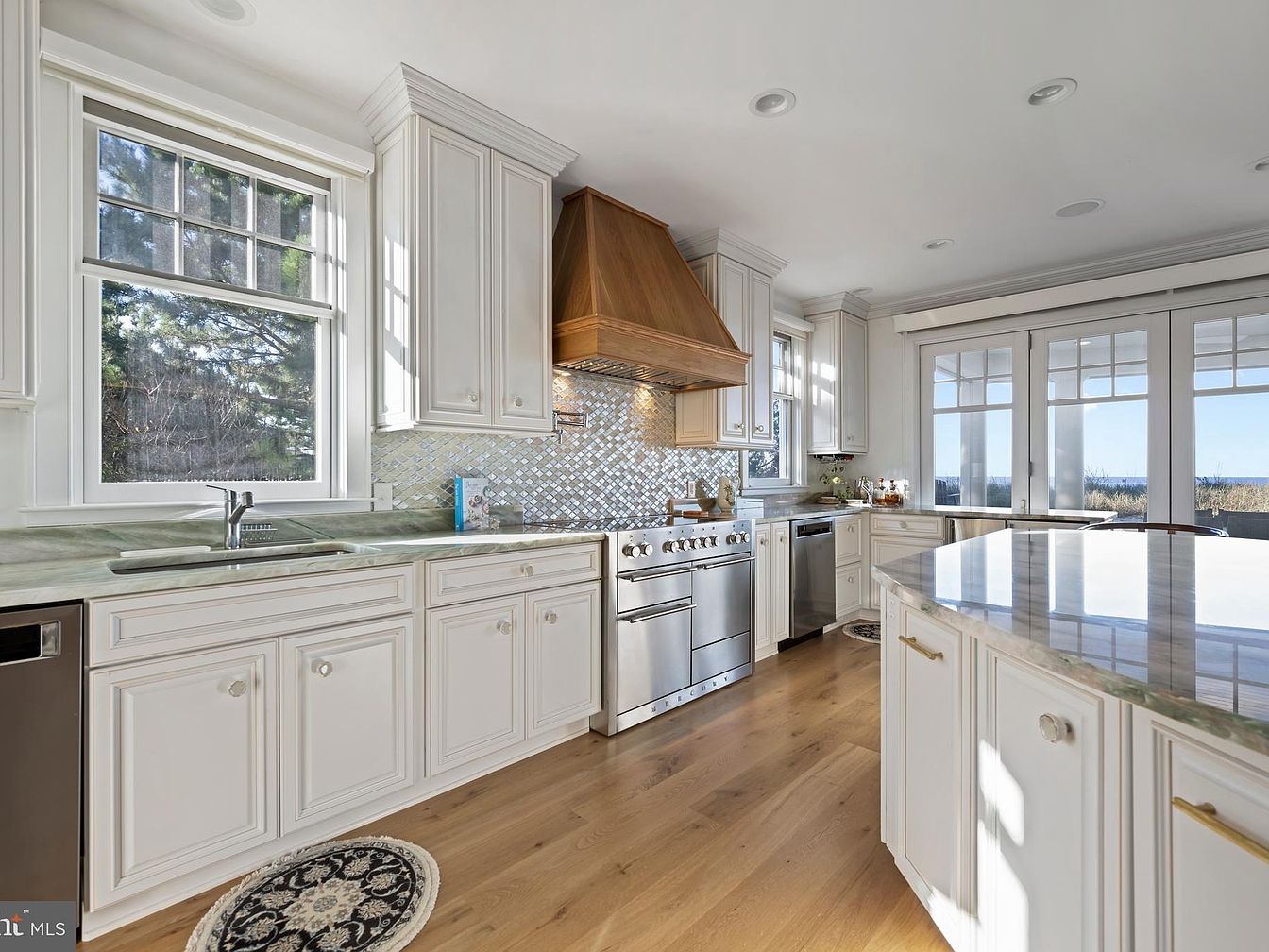 Spacious kitchen featuring classic white cabinetry with panel detailing and marble countertops. A large range with a prominent wooden range hood serves as a focal point in the space, accented by a shimmering mosaic tile backsplash. The room is illuminated by natural light streaming in from a large window above the sink and a set of double glass doors leading outside. Light hardwood floors add warmth, while stainless steel appliances provide a modern contrast. The central island offers substantial workspace with stylish brass hardware, and small area rugs add subtle decorative accents to the floor.