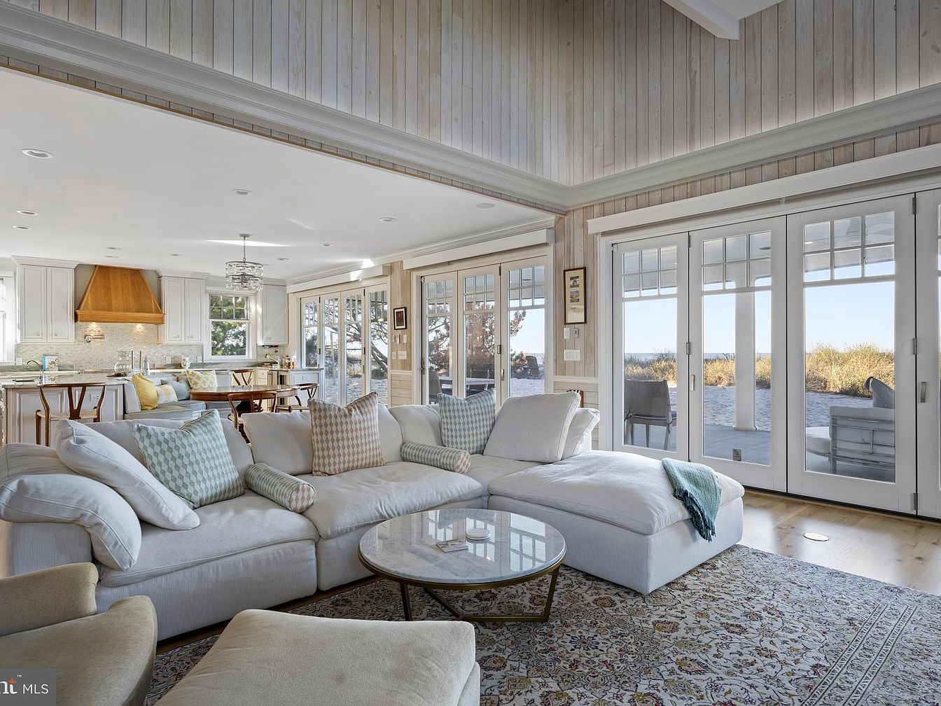 A spacious, coastal-inspired living area merges seamlessly with the kitchen and dining space. Large French doors along one wall let in abundant natural light and offer a view of the sandy dunes and sea grass beyond. The decor features a soft, neutral palette with pale wood-paneled walls and ceiling, complemented by a plush, oversized sectional sofa adorned with patterned pillows in subtle blues and creams. A round glass coffee table sits atop an ornate area rug. The kitchen features white cabinetry and a prominent wooden range hood, while a modern chandelier hangs over the dining table, creating a relaxed, airy ambiance.
