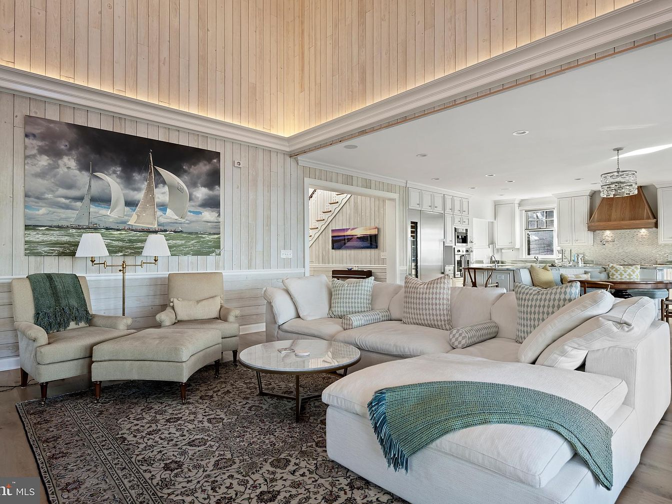 This spacious living room blends seamlessly into an open kitchen. The room features vaulted, light wood-paneled ceilings with soft, recessed lighting creating a warm ambiance. A large white sectional sofa dominates the space, accompanied by patterned throw pillows and a pale green throw. Two beige armchairs with an ottoman and a cozy green blanket provide extra seating. An intricate dark area rug grounds the seating area. On the wall, a dramatic sailboat artwork hangs above twin sconce lamps. The kitchen beyond features white cabinetry, marble countertops, a stainless refrigerator, and a statement wood and glass light fixture over the dining island.