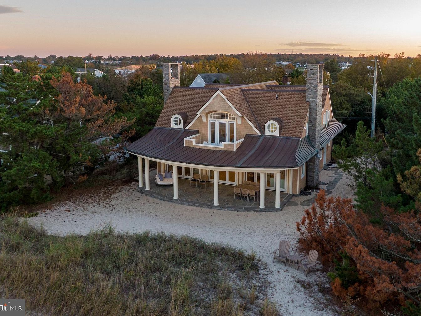 A large, shingle-style historic home is nestled among mature trees and surrounded by a sandy landscape, suggesting beachfront or coastal living. The house features a gambrel roof in a deep brown tone with two prominent stone chimneys, and classic white-trimmed dormer windows. The wide, curved covered porch wraps around the back, supported by tall white columns, providing a shaded area with outdoor seating and a dining table. Decorative elements include a softly arched balcony and symmetrical windows. Two Adirondack chairs are placed on the sand near the home, creating a relaxed, inviting atmosphere for enjoying the natural surroundings.