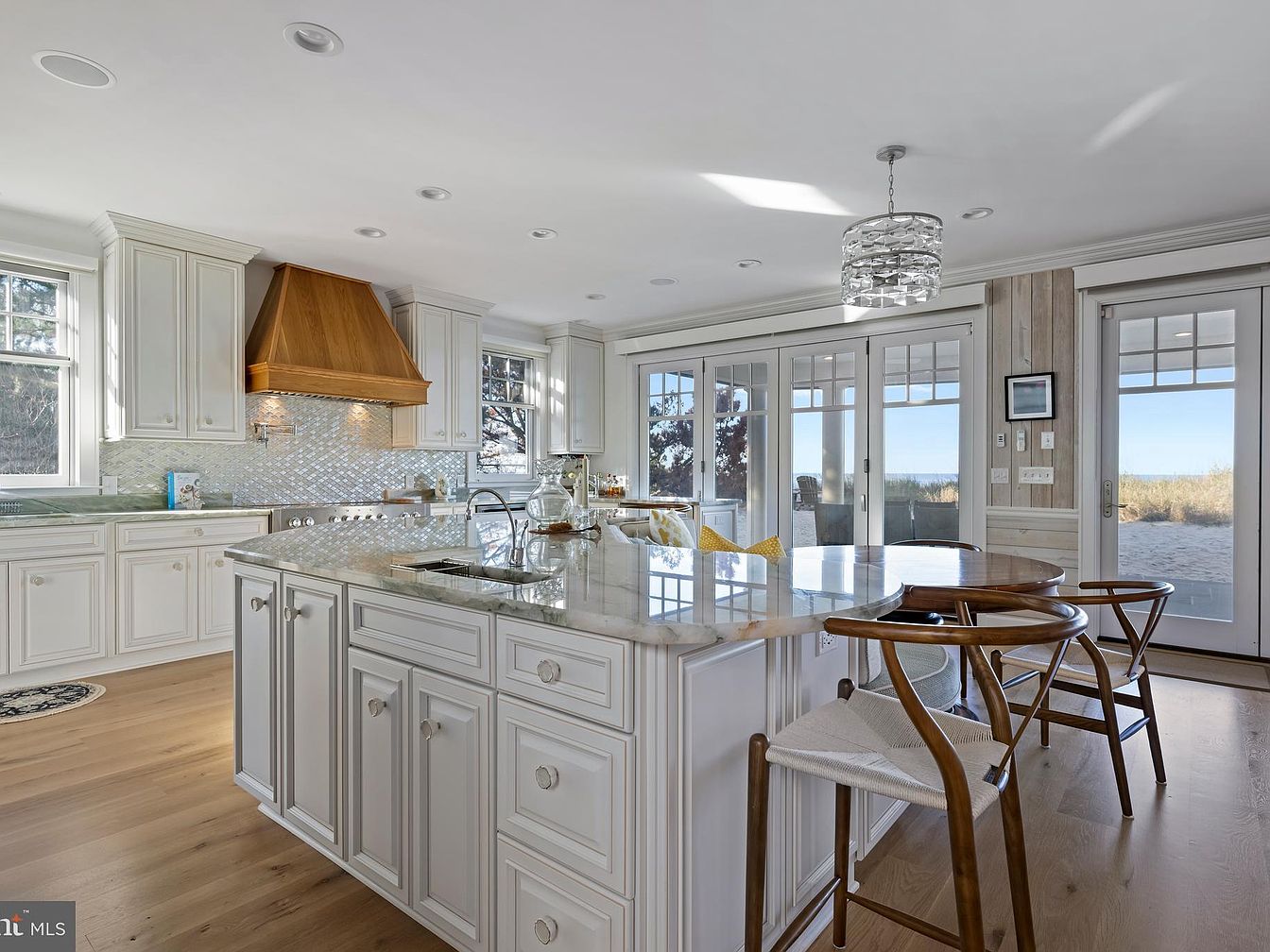 This airy kitchen features a central island with a marble countertop and soft white cabinetry, offering ample workspace and storage. The open-concept layout enhances the sense of spaciousness, highlighted by light wood floors and abundant natural light streaming through large windows and glass doors. A wooden range hood creates a warm focal point above the cooking area, complemented by an intricate tile backsplash. A round dining table with elegant wooden chairs adds a modern touch. The overall palette is soft and neutral, emphasizing whites and natural wood tones that evoke a coastal, serene ambiance, and provide seamless indoor-outdoor flow.