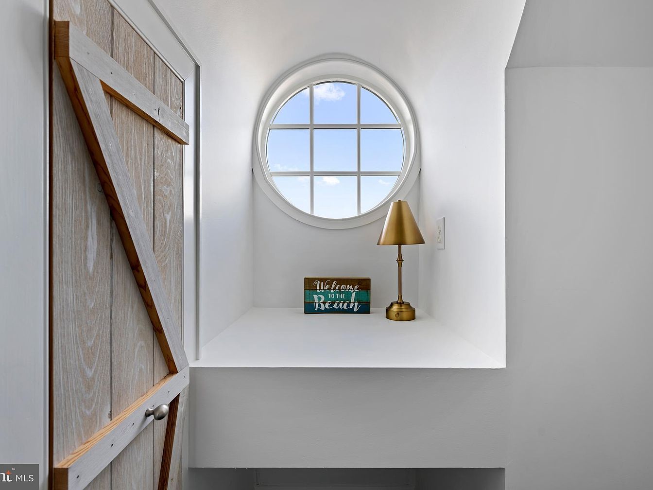 A small alcove sits at the end of a hallway, illuminated by natural light streaming through a round window with a grid pattern. The walls and built-in shelf are painted bright white, creating a clean, airy atmosphere. On the shelf, a brass lamp with a conical shade adds a touch of elegance, next to a decorative sign reading ‘Welcome to the Beach’ in blue and gold. To the left, a rustic sliding barn door made of light-colored, weathered wood contrasts the otherwise modern, minimal setting, adding warmth and a touch of farmhouse character.