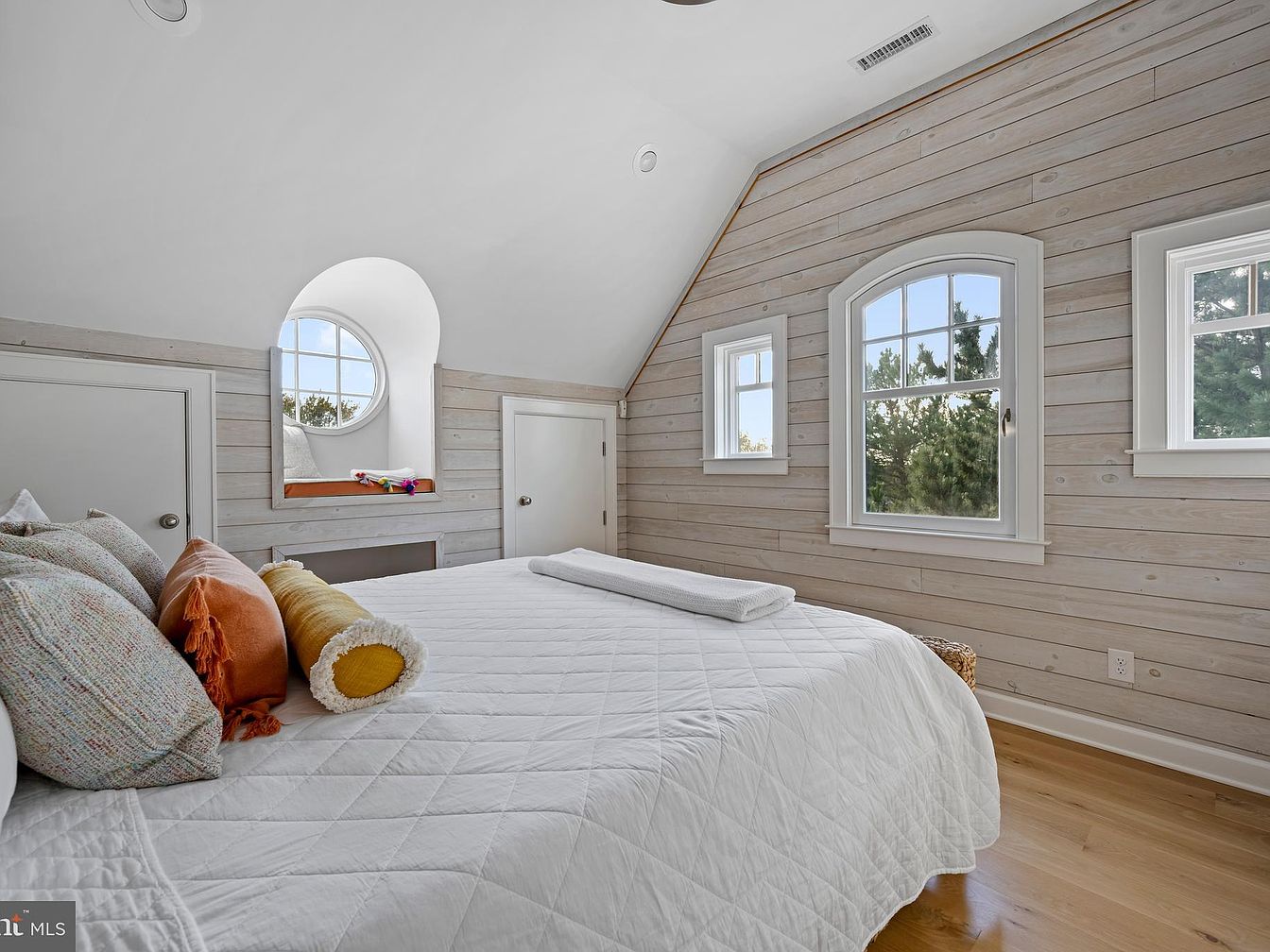 A cozy bedroom with a sloped ceiling, featuring light wood paneling on the walls and light hardwood floors. The space is brightened by three windows with white trim, two rectangular and one arched, allowing plenty of natural light to enter. A large bed with a white quilted coverlet is decorated with an assortment of pillows in muted tones like white, orange, and yellow. There is a charming window seat with a round, arched window above, topped with folded towels. Built-in closet doors with brushed metal knobs add to the room’s simple, coastal-inspired aesthetic.