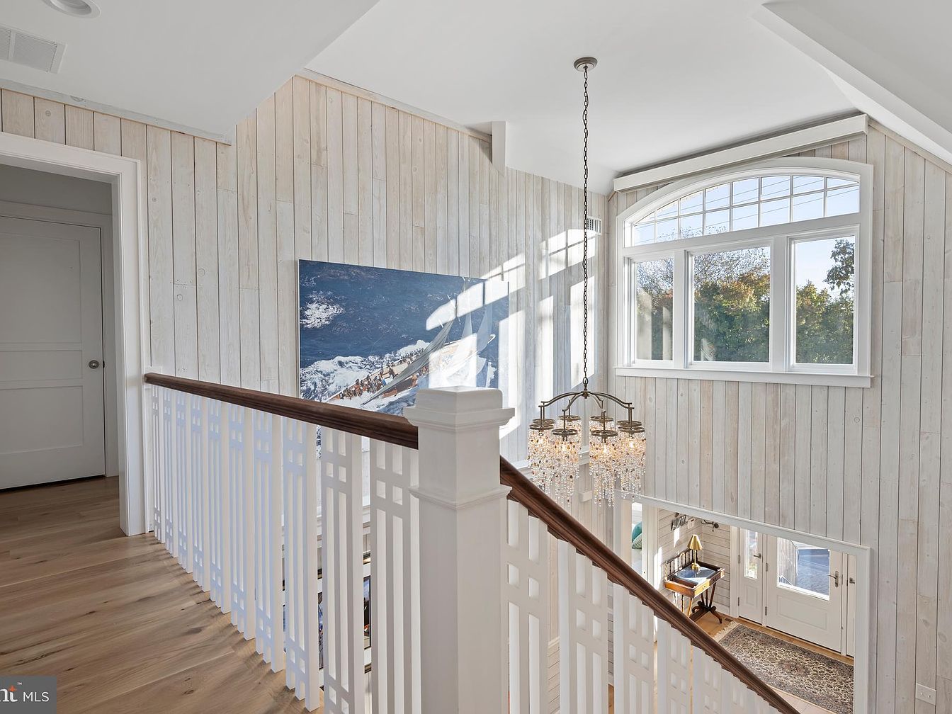 Bright, airy staircase landing with whitewashed vertical wood paneling covers the walls, creating a breezy, coastal feel. Natural light streams in through a large arched window above, illuminating the chandelier suspended over the stairwell. White-painted balusters with geometric cutouts and a dark-wood handrail line the stairs and landing. Wide, lightly stained wood plank floors enhance the sense of space, while a large modern maritime artwork serves as a focal point on the wall. The lower entryway is visible, featuring a patterned rug and a small side table, tying in a comfortable, welcoming atmosphere.