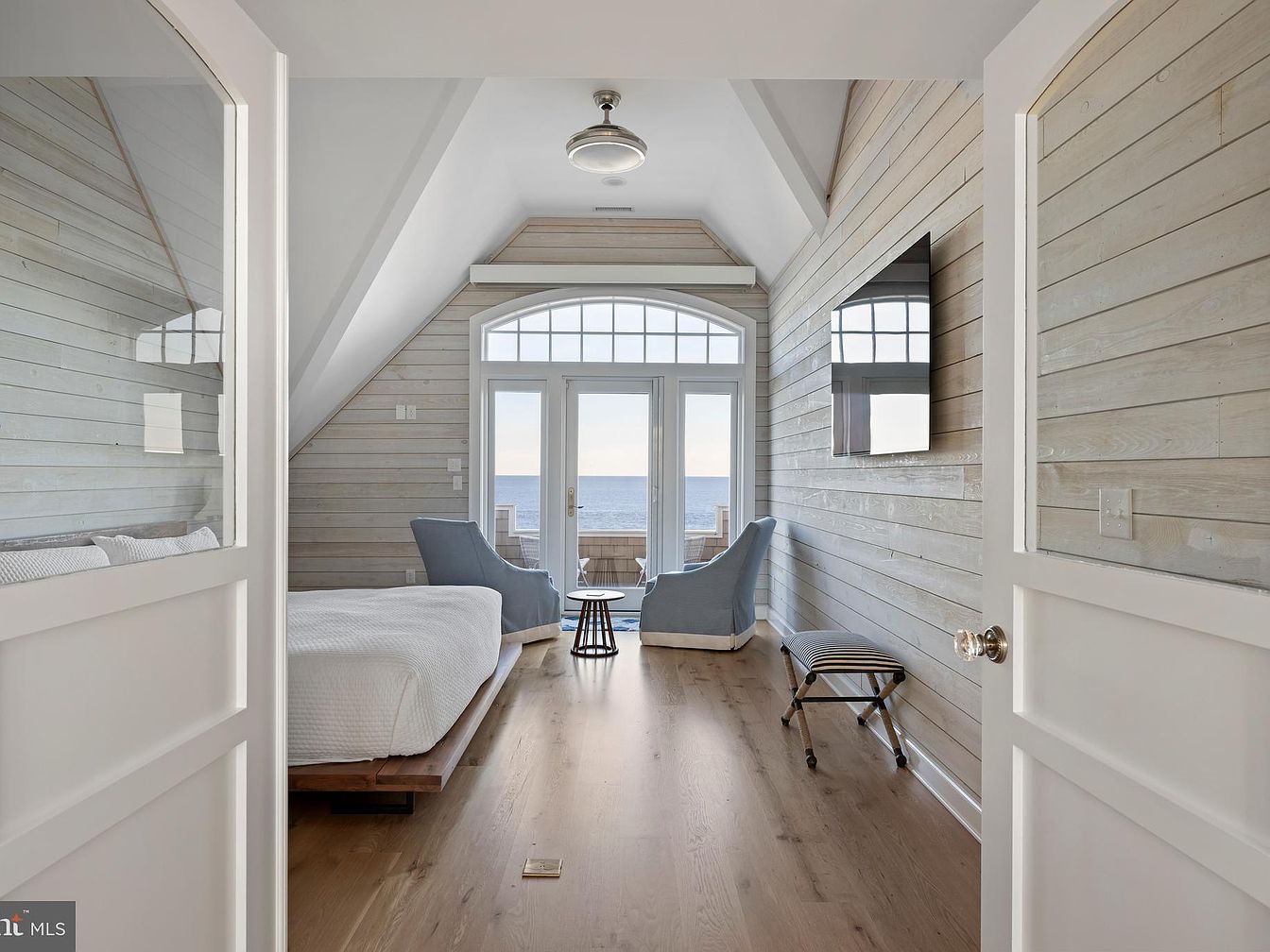 Bright and airy bedroom featuring light wooden floors and soft grayish-beige shiplap walls. The room has a vaulted ceiling and large French doors topped with an arched window, opening to a balcony overlooking the ocean. A low, modern bed with white bedding is positioned to the left, while two blue-gray armchairs and a small side table sit near the windows, capitalizing on the view. A wall-mounted flat-screen TV and a striped ottoman are on the right. Minimal decor and a cool, neutral palette create a serene and coastal retreat.