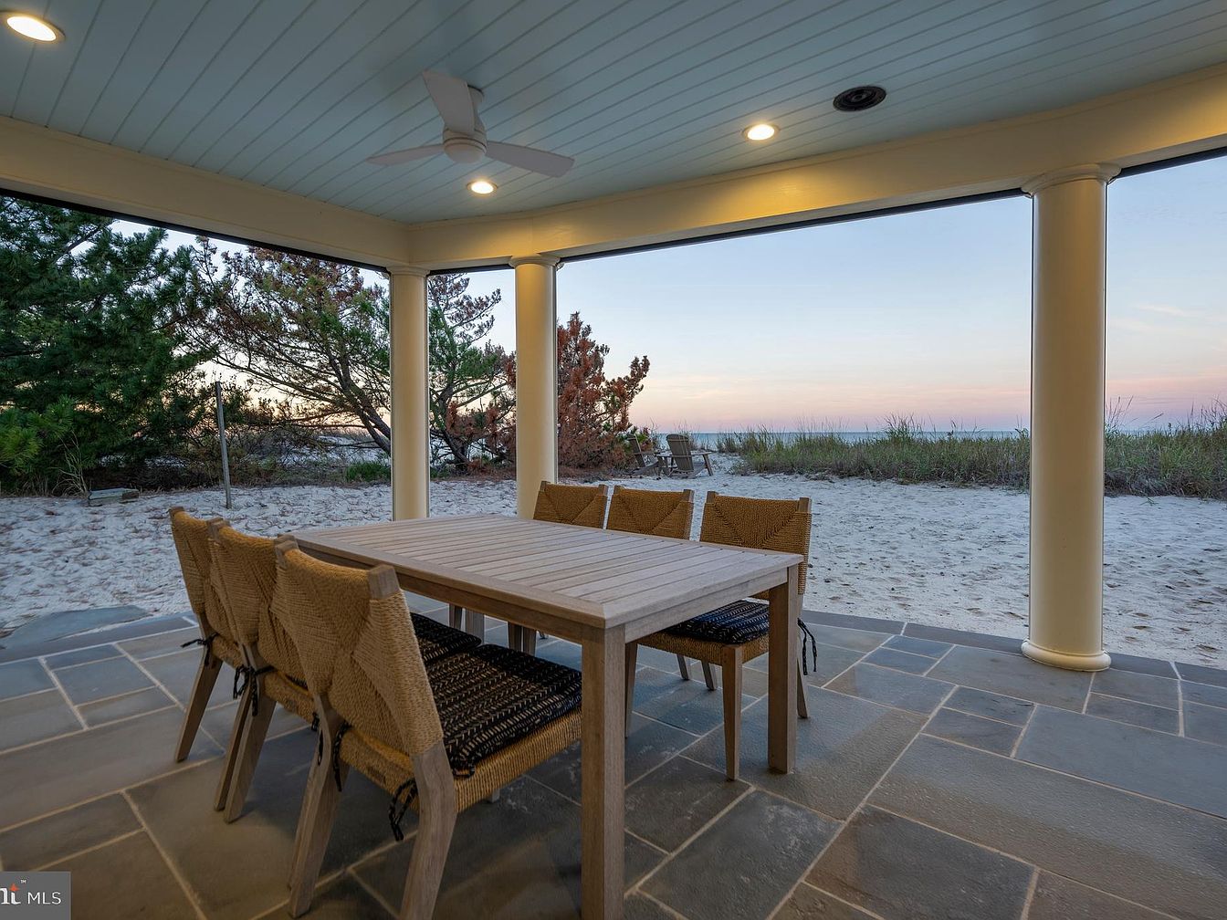 A spacious covered patio opens directly onto sandy dunes, framed by classic white columns and offering a sweeping ocean view. Slate gray stone tiles form the patio floor, complemented by pale blue plank ceiling with recessed lighting and a ceiling fan for comfort. The focal point is a sturdy wooden dining table surrounded by six woven, natural-fiber chairs in earth tones. The atmosphere is relaxed and open, with soft natural lighting and beach grass in the distance, creating an inviting spot for outdoor dining and enjoying the sea breeze in a sophisticated yet casual setting.