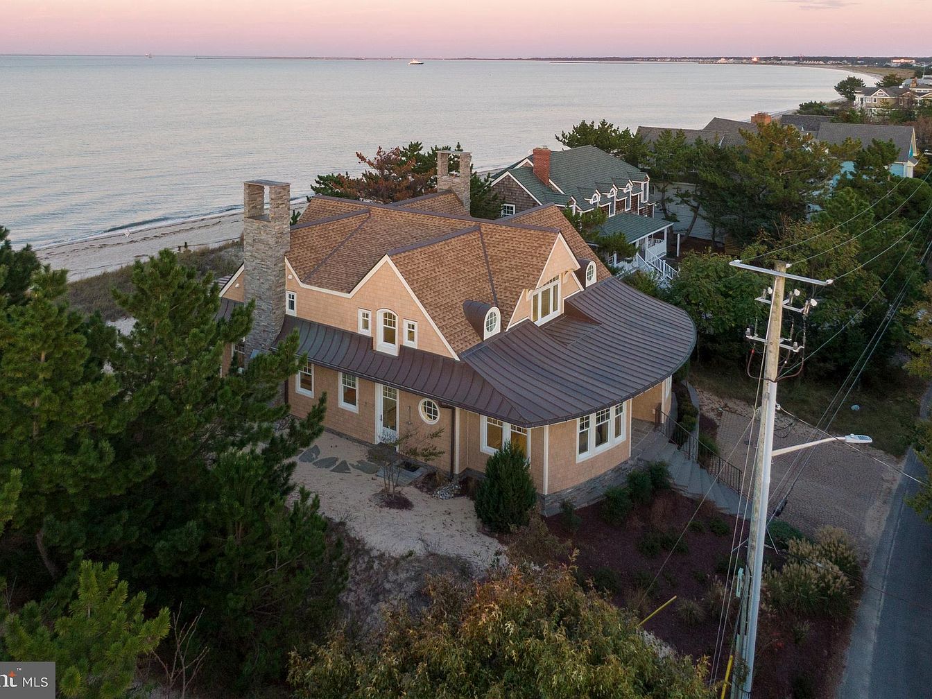 A large historic home sits along the sandy shoreline, characterized by tan shingle siding and a brown metal roof with gentle curves and gables. The house features a robust stone chimney and several white-trimmed windows, some arched, accentuating classic coastal architecture. Pine trees and seaside vegetation partially surround the property, blending naturally into the landscape. The front entryway offers a paved path bordered by shrubs, while a small porch adds to the charm. The calm waters and pastel hues of the sunset create a serene, inviting atmosphere, highlighting the home’s picturesque location and timeless curb appeal.