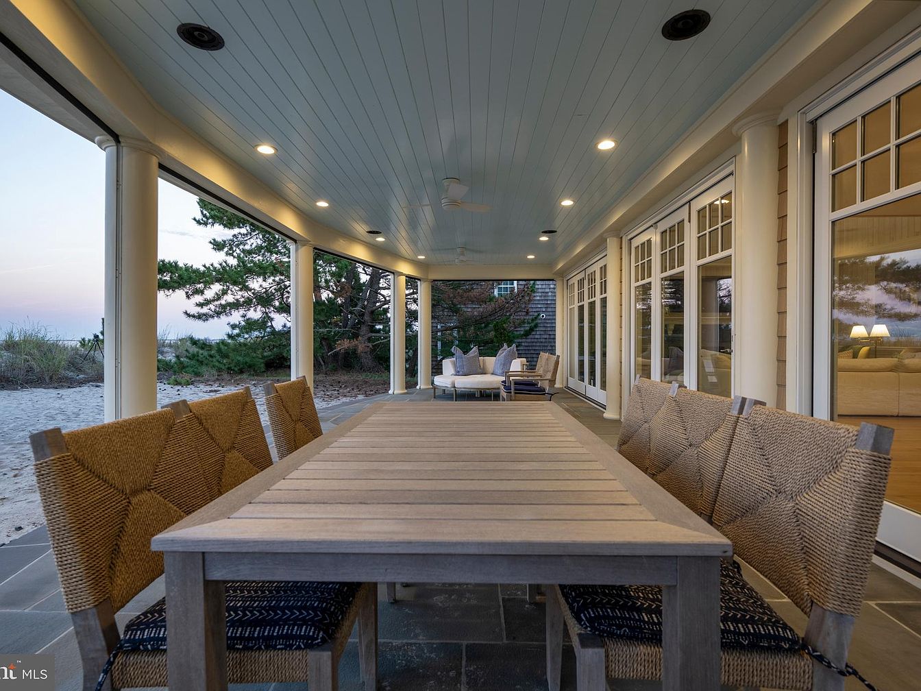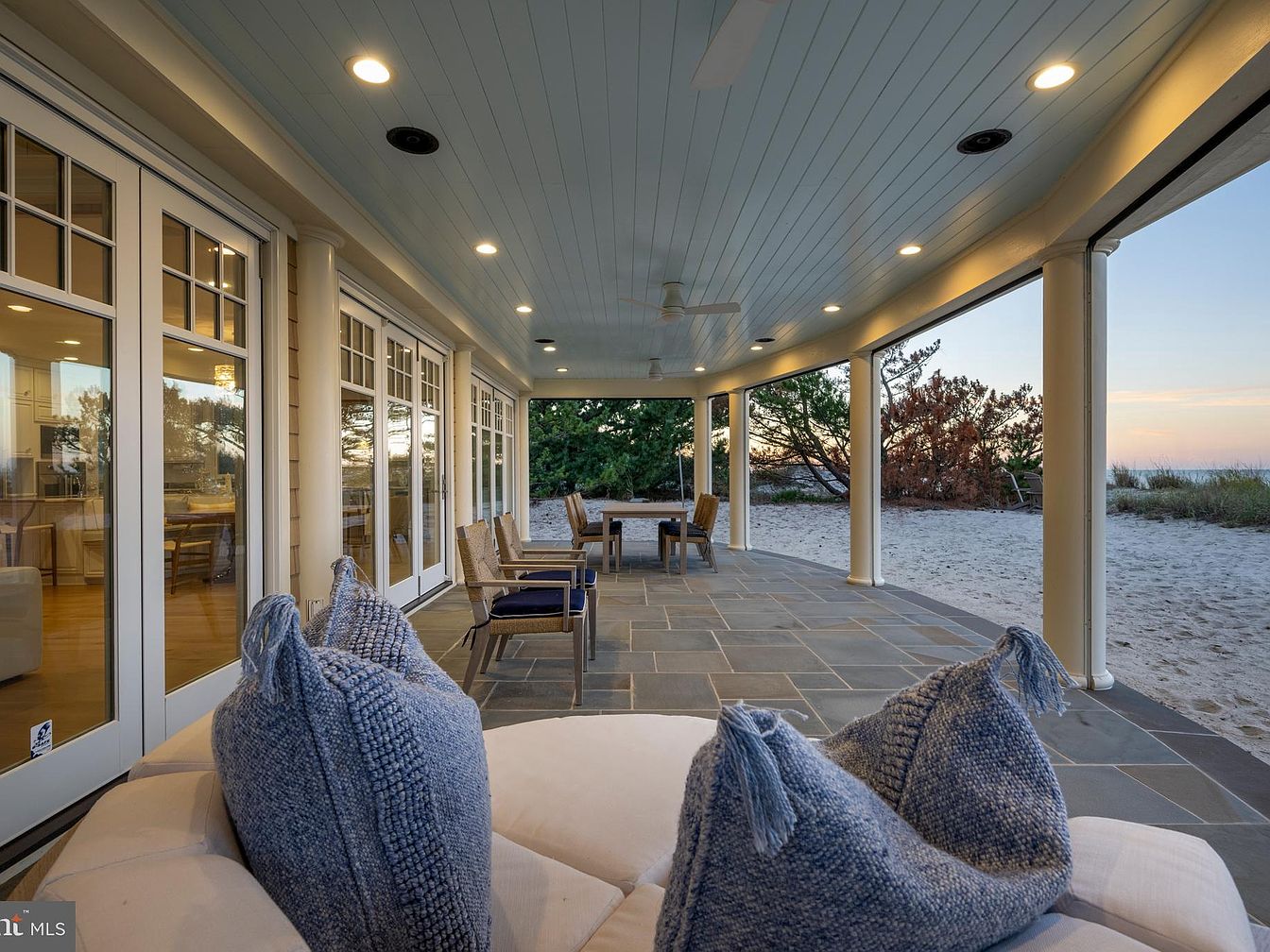 A spacious covered patio area stretching along the back of the house, bordered by broad white columns and large French doors with divided glass panes, offering seamless access indoors. Neutral blue-grey slate tile flooring complements the soft blue-painted ceiling, accented with recessed lighting and ceiling fans for comfort. Plush outdoor seating with textured blue pillows offers a cozy spot, while a wooden dining set is positioned further down for al fresco meals. The sandy beach transitions directly from the edge of the patio, framed by natural landscaped dunes and coastal foliage, creating a serene and elegant outdoor living space.