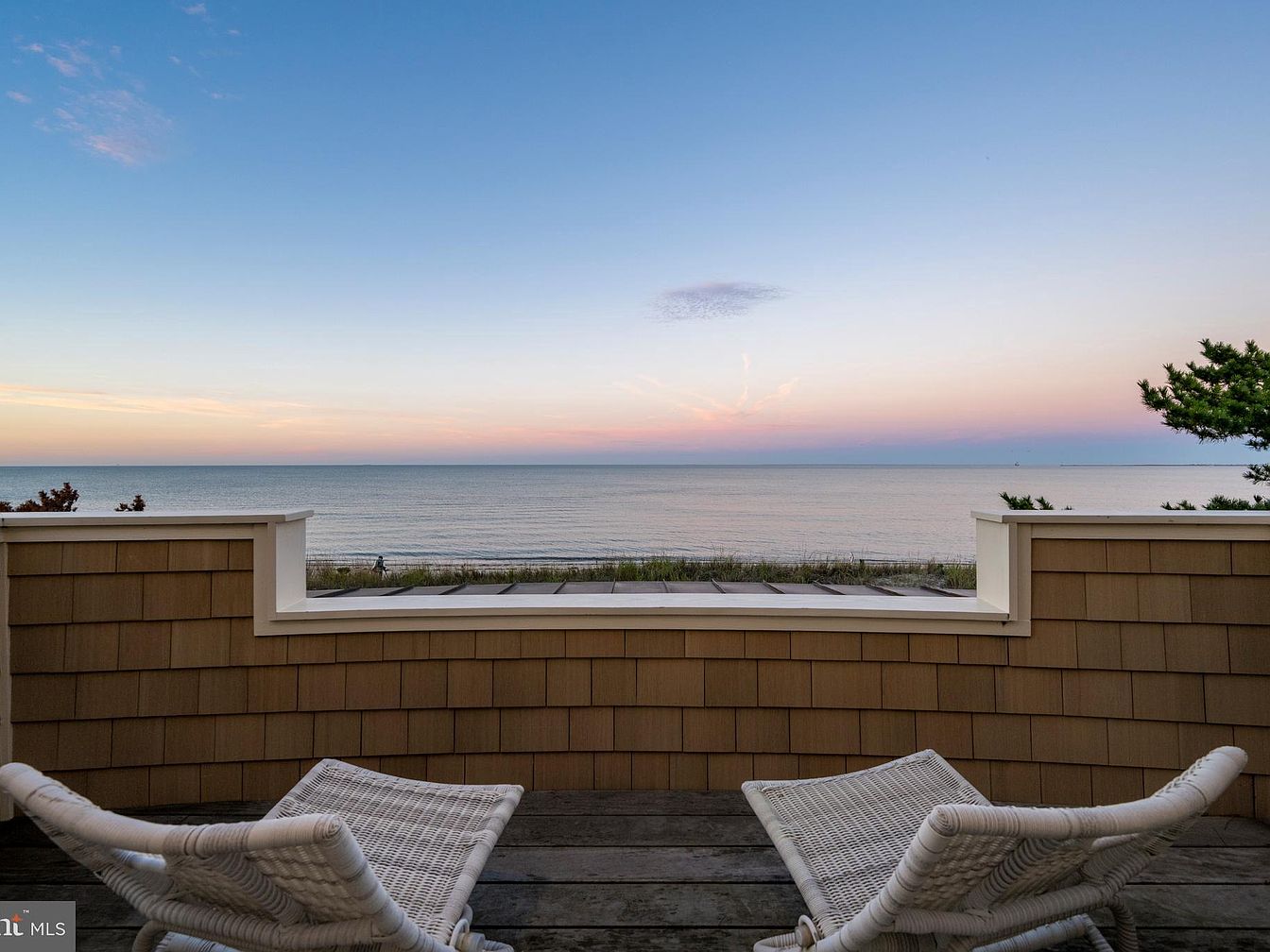 Two white woven lounge chairs are positioned on a small wooden balcony overlooking a serene expanse of ocean and pale sandy beach. The balcony’s railing features warm tan shingles framed by crisp white trim, giving it a classic coastal look. Grasses and low shrubs peek above the border, leading the eye to the calm, open waters that blend seamlessly with a pastel-hued sky at dusk. The muted tones of the sunset create a peaceful, restorative setting designed for relaxation. The simple, natural materials and expansive view evoke a timeless, beachside retreat atmosphere.
