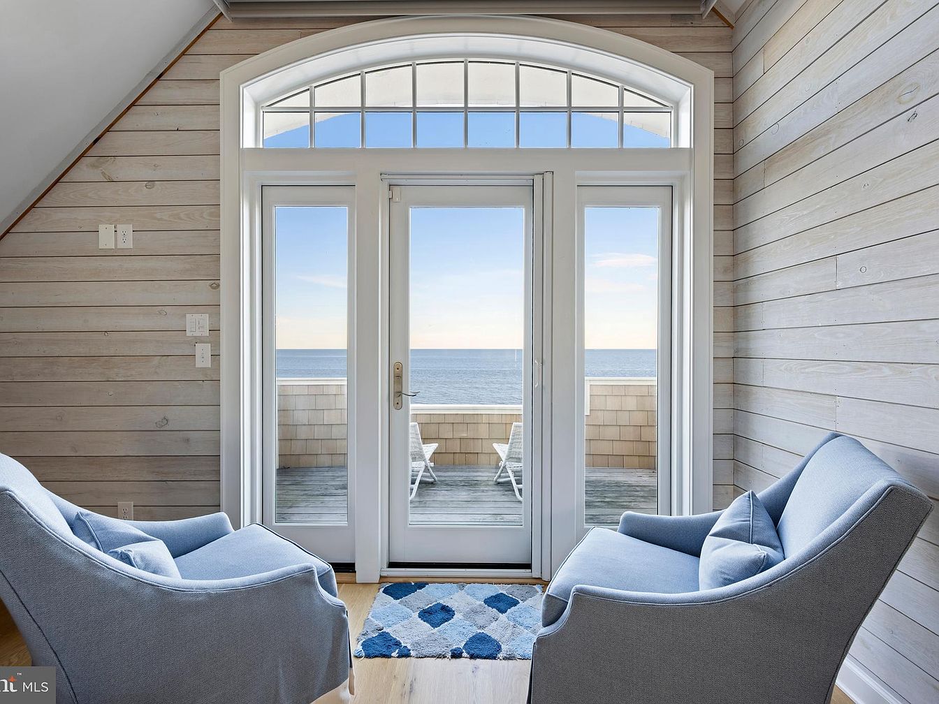 A cozy seating nook featuring two light blue armchairs angled toward a pair of glass doors leading to a balcony with an expansive ocean view. The walls are clad in pale grayish wood planks arranged horizontally, lending a coastal, beach house aesthetic. Above the door, a large arched transom window lets in ample natural light, brightening the space. A small rug with blue and white geometric patterns sits on the honey-toned wood floor between the chairs. Outside, the balcony is partially visible with neutral shingles and a wooden deck, enhancing the airy, serene atmosphere of the room.