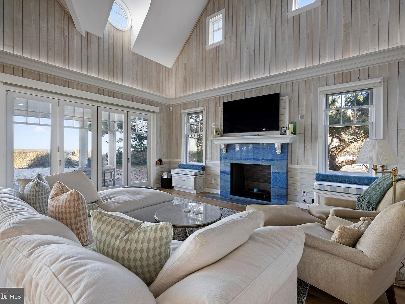 A spacious living room delivers a serene coastal aesthetic with pale wood-paneled walls rising to a peaked, vaulted ceiling lit by a round clerestory window. French doors with transom windows open to a sandy outdoor area, allowing natural light to flood the space. A plush sectional sofa arranged around a marble-topped coffee table features soft pastel, diamond-patterned pillows. The focal point is a striking blue stone fireplace with a white mantel, above which is mounted a large flat-screen TV. Window seats with blue cushions, classic white trim, and a cozy armchair with a throw blanket complete the room’s airy, inviting atmosphere.