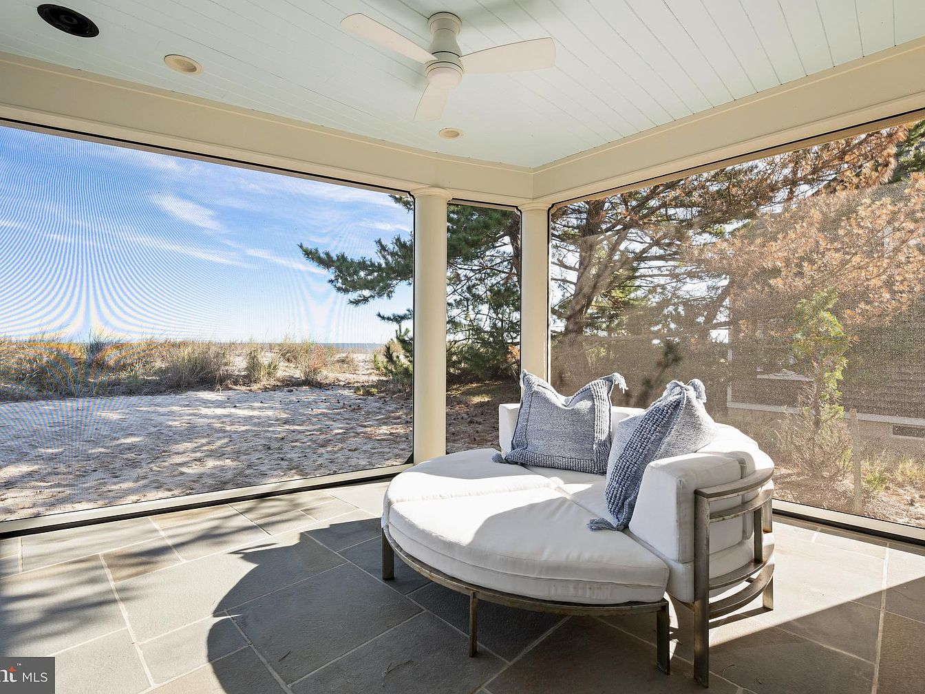 A tranquil screened porch with panoramic views of a sandy beach and coastal landscape beyond. The space features large, floor-to-ceiling screened windows that invite abundant natural light and showcase the scenic outdoors. The flooring is composed of stone tiles in cool, neutral tones. Centered in the room is a modern, round chaise lounge upholstered in crisp white fabric, accented by textured blue throw pillows for a cozy yet refined look. The ceiling is painted a soft pastel blue and includes a white ceiling fan, adding a light and breezy atmosphere ideal for relaxation and coastal living.