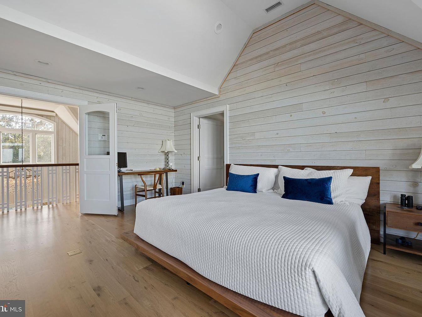Spacious bedroom with light wood plank walls and a wood-plank cathedral ceiling, creating a rustic yet airy feel. The king-sized bed features a wooden frame, crisp white bedding, and deep blue accent pillows. Natural light streams in from a large window over a landing just outside the room, accented by white trim and a wood railing. Minimalist furnishings include a sleek wooden nightstand, an understated desk with a classic chair, and a simple table lamp. Wide-plank natural wood floors add warmth and texture, while the space is kept uncluttered, emphasizing clean lines and a calm, serene ambiance.