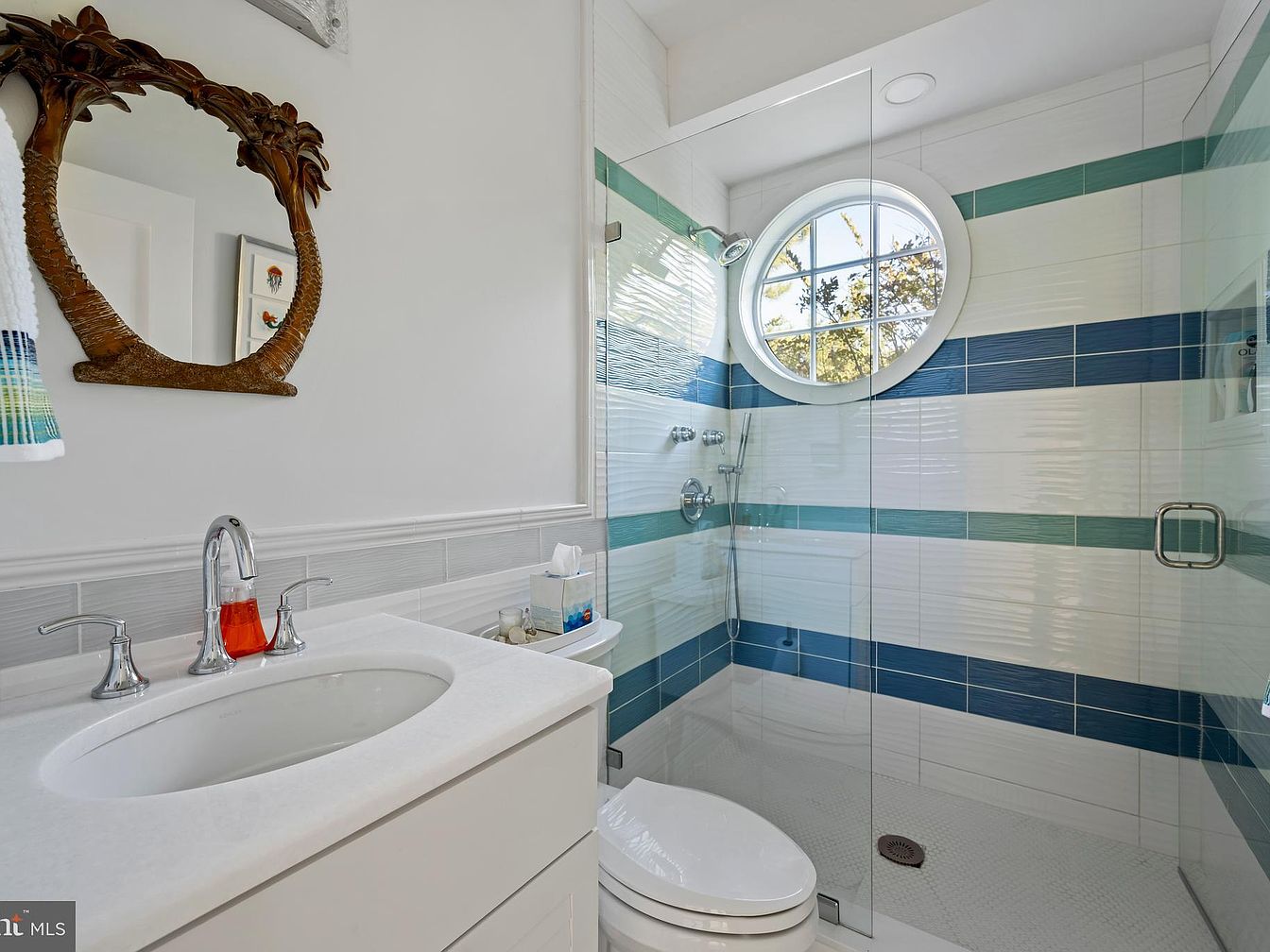 A compact and airy bathroom featuring a glass-enclosed shower with striking horizontal teal and blue tiles set against crisp white walls. A round window with a grid pattern allows natural light to flood the room, creating a bright and inviting space. The vanity has a clean, white countertop with a sleek faucet and matching handles. Above it hangs a whimsical palm tree-framed mirror, adding a touch of tropical charm. Soft accent details include an ocean-inspired towel and minimalist decor, keeping the look fresh and uncluttered. The overall design balances coastal vibes with modern fixtures for a relaxed yet stylish atmosphere.