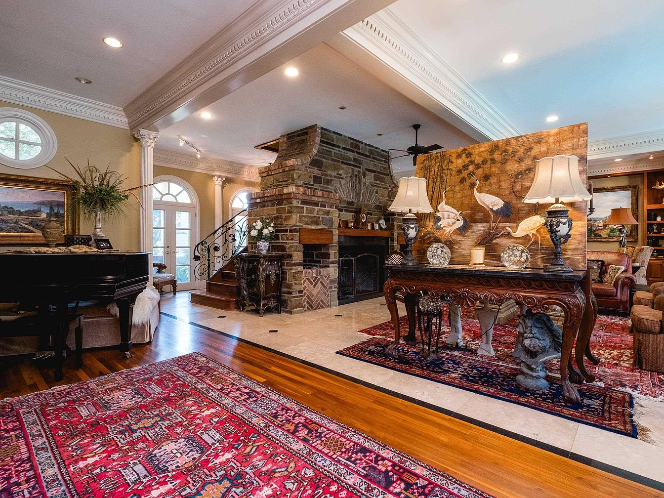 This living room features a harmonious blend of classic and contemporary design elements. The warm earth tones and soft lighting create an inviting ambiance. A grand piano sits in one corner, adorned with decorative items and a gentle throw. Eye-catching stonework frames the traditional fireplace, adding texture and depth. Elegant columns frame the space, while intricate crown molding enhances the ceiling’s sophistication. A rich Persian rug anchors the seating area, complementing the ornate furniture. Decorative lamps provide warm light, and a detailed partition showcases elegant artwork, enriching the room’s aesthetic with a touch of history.