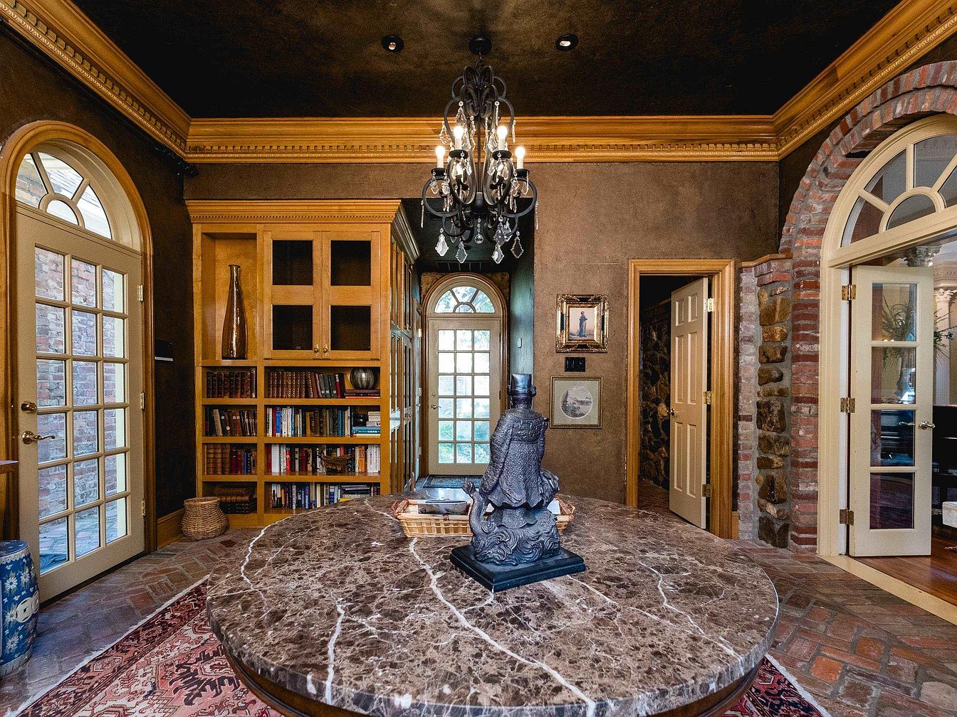 This entryway features a circular marble table at its center, showcasing intricate veining. Rich brown walls provide a warm backdrop, complemented by a notable black chandelier that hangs from a textured ceiling. Tall, arched windows illuminate the space, while a mix of wooden elements adds sophistication. To the left, a stylish bookshelf displays an array of books and decorative items, enhancing the room’s intellectual vibe. Textured bricks and muted tones create a blend of rustic and elegant aesthetics. Through the doors, glimpses of detailed stonework and art invite exploration beyond this welcoming entry.