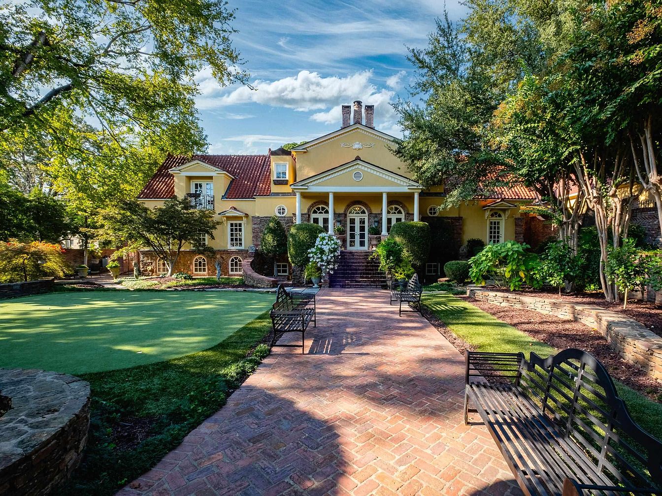 The front entrance showcases a grand façade, featuring a soft yellow hue complemented by dark stone accents. A series of symmetrical windows with arched tops provide an inviting look, while elegant double doors are flanked by tall columns. A wide, brick pathway leads up to the entrance, bordered by meticulously landscaped greenery, including manicured hedges and vibrant flower beds. Benches with intricate ironwork are positioned along the pathway, offering spots for relaxation. The sloped roof is adorned with terracotta tiles, enhancing its classic charm, while lush trees provide natural shade, creating a serene atmosphere.