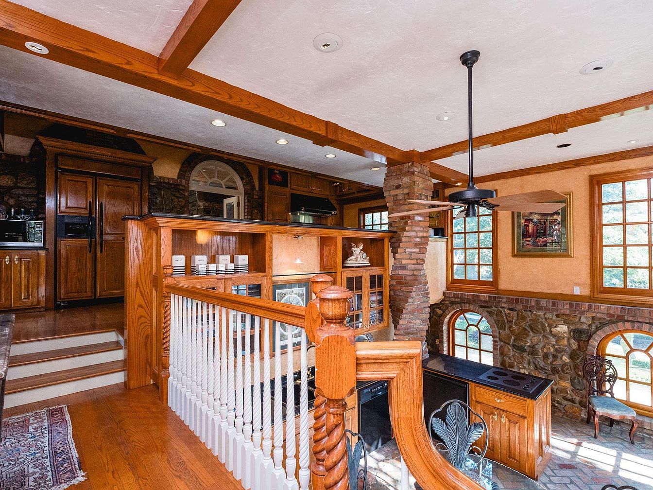 This kitchen blends rustic charm with modern functionality. A stone accent wall features large, arched windows that flood the area with natural light, highlighting warm wooden beams overhead. The cabinetry is crafted from rich oak, complementing the dark granite countertop and seamlessly integrating appliances. A circular dining table with intricate metal chairs occupies a cozy corner, enhanced by an eye-catching decorative vase. The brick flooring adds texture and warmth, while the open staircase leads to a loft space, creating an inviting ambiance that encourages both culinary creativity and casual dining.