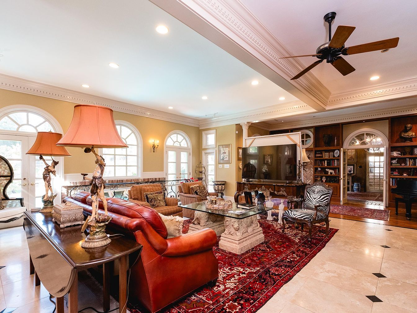 This spacious living room features an open layout with large arched windows allowing natural light to flood the area, enhancing its warm, inviting ambiance. The cream walls contrast beautifully with ornate crown molding. A rich, rust-colored leather sofa is complemented by patterned throw pillows and sits atop an intricate red Persian rug. Glass-topped coffee tables rest on sculpted stone bases, while stylish armchairs echo the sofa’s elegance. Architectural details such as columns add sophistication. A large television blends into the decor, with tasteful decorative accents like a unique floor lamp and vibrant blooms adding pops of color.