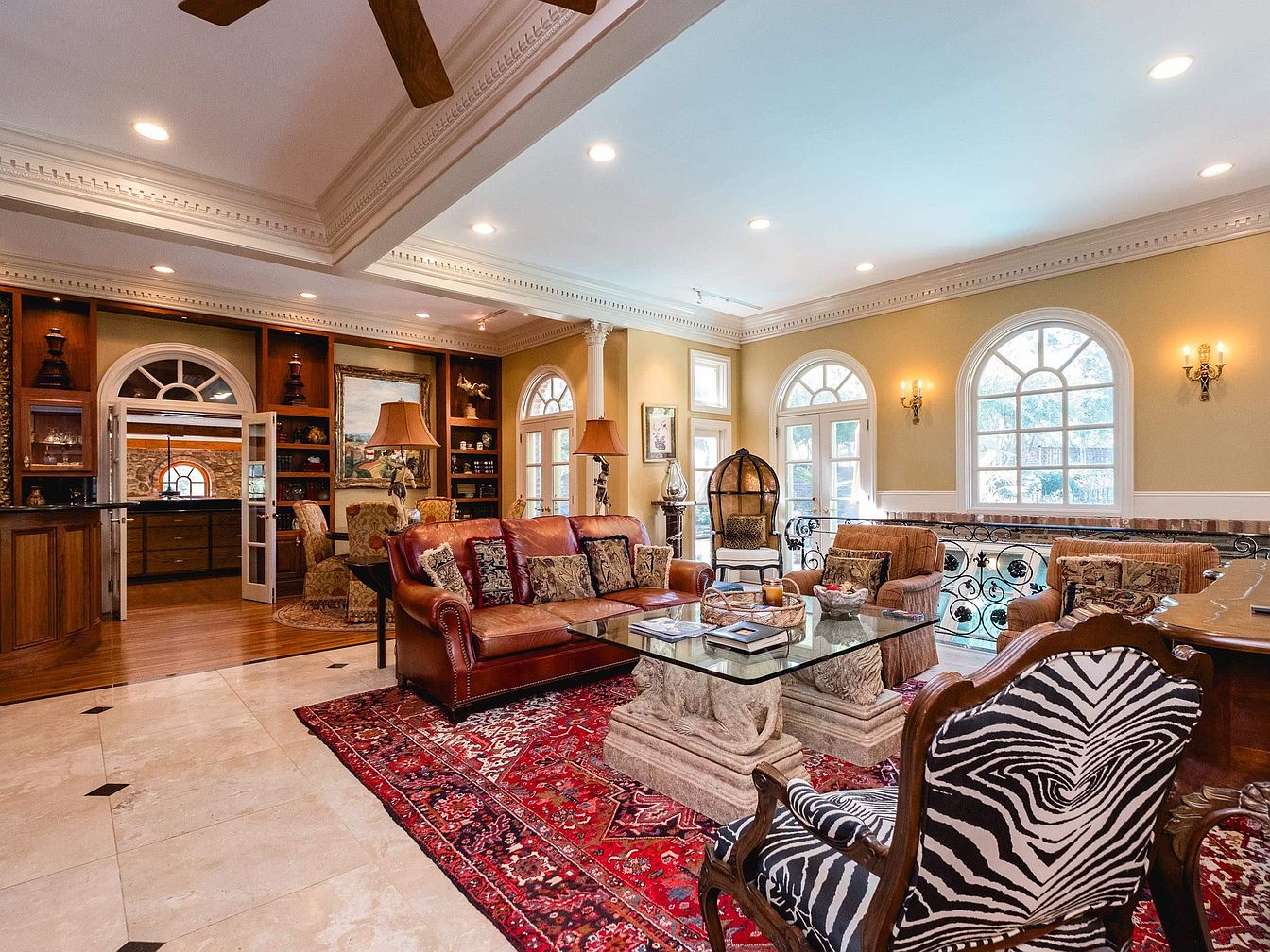 This elegant living room features a harmonious blend of classic and contemporary design elements. Warm, neutral walls complement rich wooden accents, while intricate crown molding enhances the ceiling’s elegance. Plush leather sofas, adorned with colorful pillows, provide comfort, while a striking zebra-print chair adds a bold contrast. A large area rug with intricate patterns anchors the space. Light filters through arched windows, illuminating carefully curated decor, including artwork and lampshades. The open layout connects to a stylish dining area, enhancing the room’s spacious feel. Overall, the ambiance invites relaxation and social interaction, showcasing sophistication.