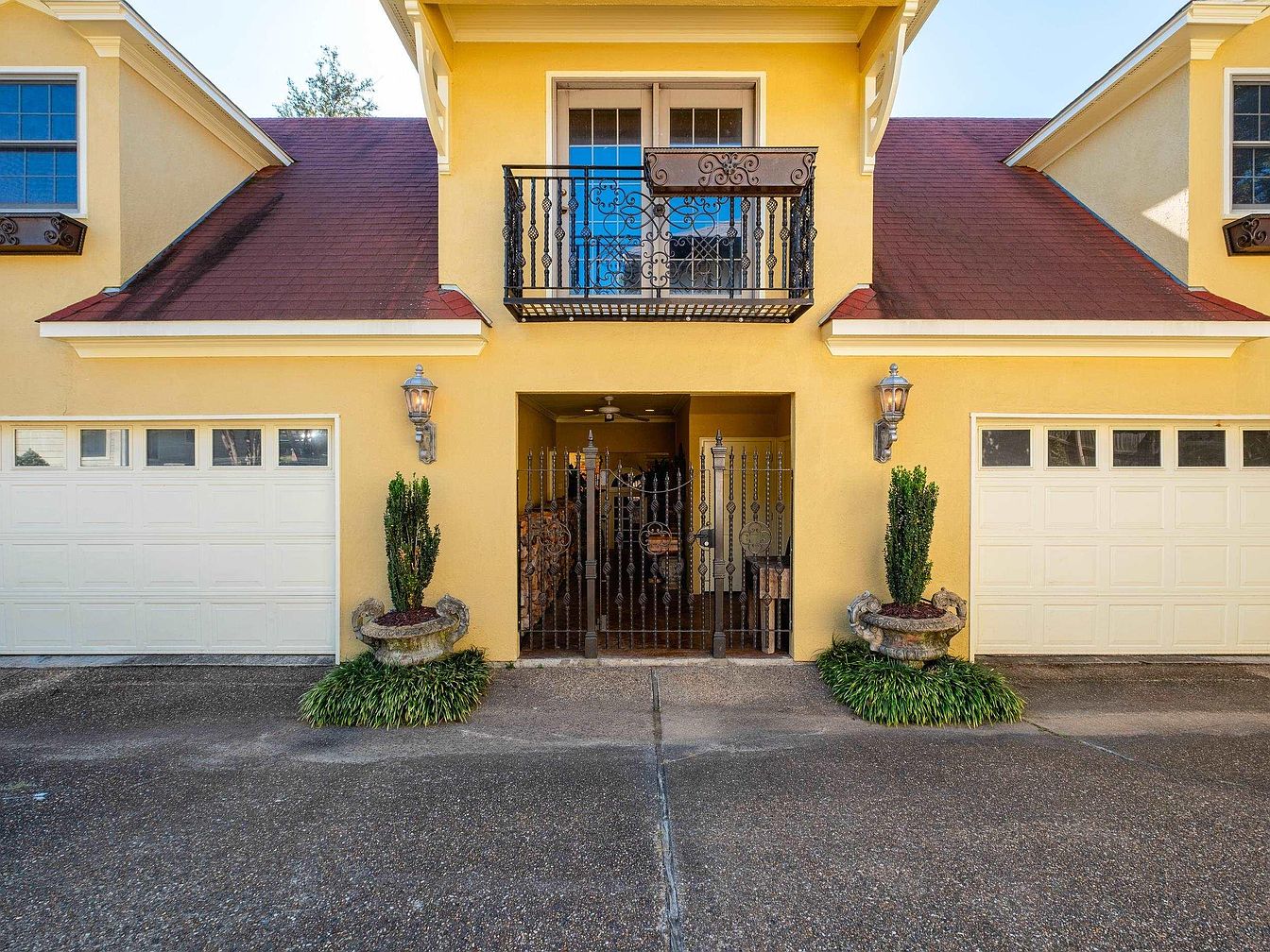 The front entryway showcases a vibrant yellow exterior contrasted by a deep red roof. A decorative black balcony adds elegance above the entrance. The grand double doors, flanked by intricately designed wrought iron gates, lead into a cozy interior. On either side of the driveway, lush greenery and well-maintained potted plants add a touch of life, with one featuring ornate stonework. Elegant light fixtures enhance the charm, casting a warm glow. The garage doors are neatly designed, incorporating small windows that add interest. The overall aesthetic combines classic style with inviting elements, making it a welcoming entry point.